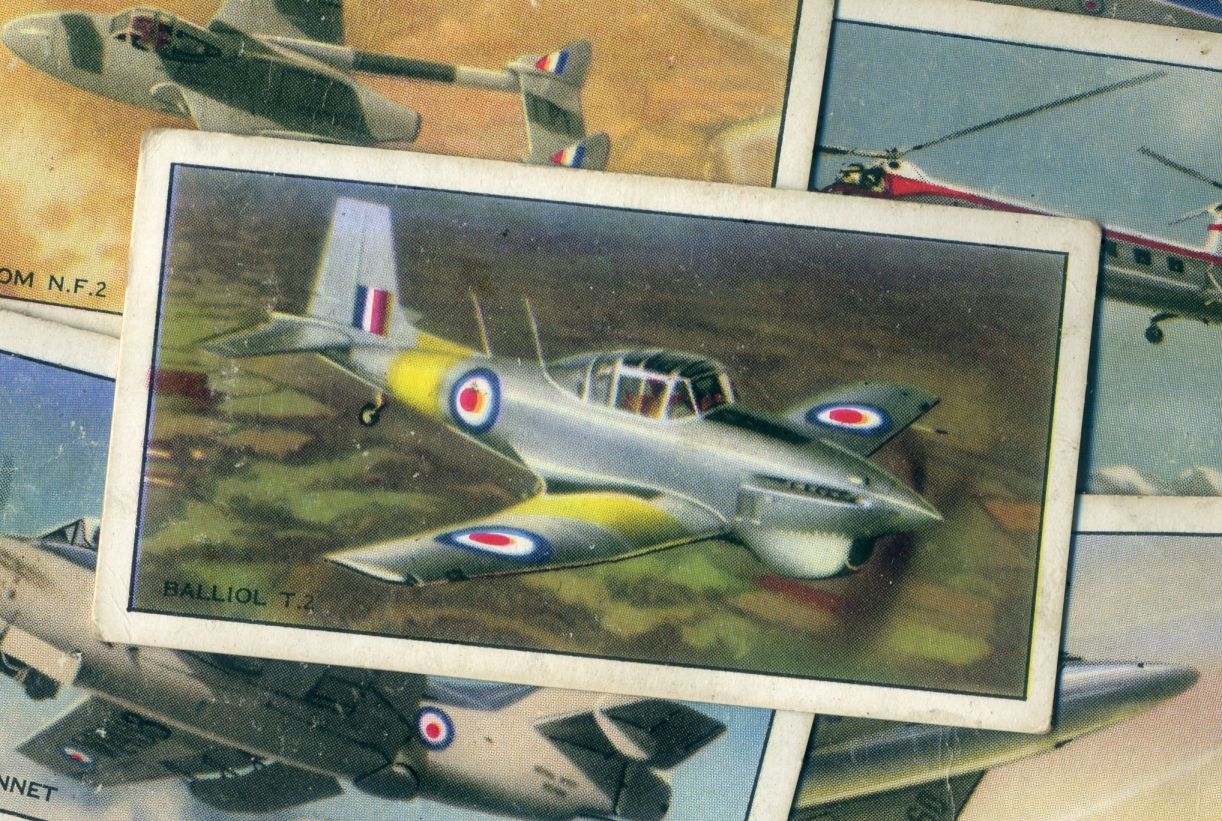 For obvious reasons, trade cards have never been big in the world of tinned veg. Quite how Lincolnshire firm Beulah’s delivered collectables such as this 1953 card to their customers, I couldn’t say. Tucked behind the label, perhaps. Introduced by the RAF in 1950, the Merlin-engined Boulton Paul Balliol was, according my copy of this Ray Sturtivant tome, a solid if demanding side-by-side trainer. Unusually, “aileron, elevator and rudder had to be retrimmed for every speed and power change” and students needed to be wary of potentially calamitous torque stalls: “When full power was abruptly applied from low revs at low speeds near a stalling configuration, the aircraft tried to revolve around the prop!”
