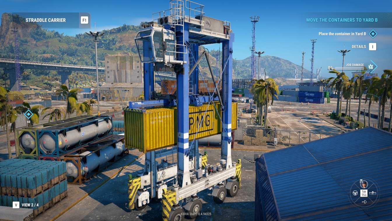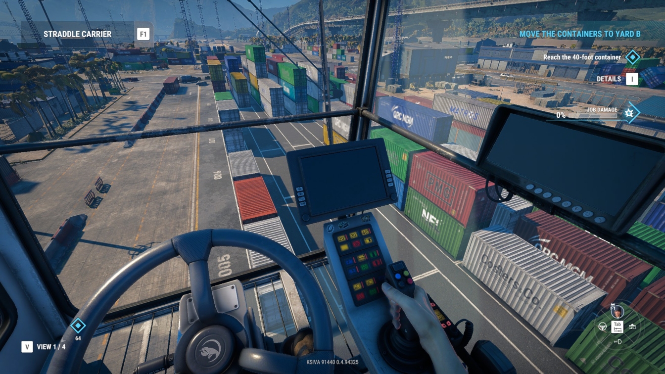 The strangest and most endearing virtual vehicle I’ve driven this month? Undoubtedly the straddle carrier in the Docked demo. One of three types of useable port plant in Sabre’s short but promising trial (you can also have a go on a ship-to-shore crane and a reach stacker) it turns on a sixpence thanks to all-wheel steering, and comes with a prototypical glass-floored cab that can be rotated to face forwards or sideways.