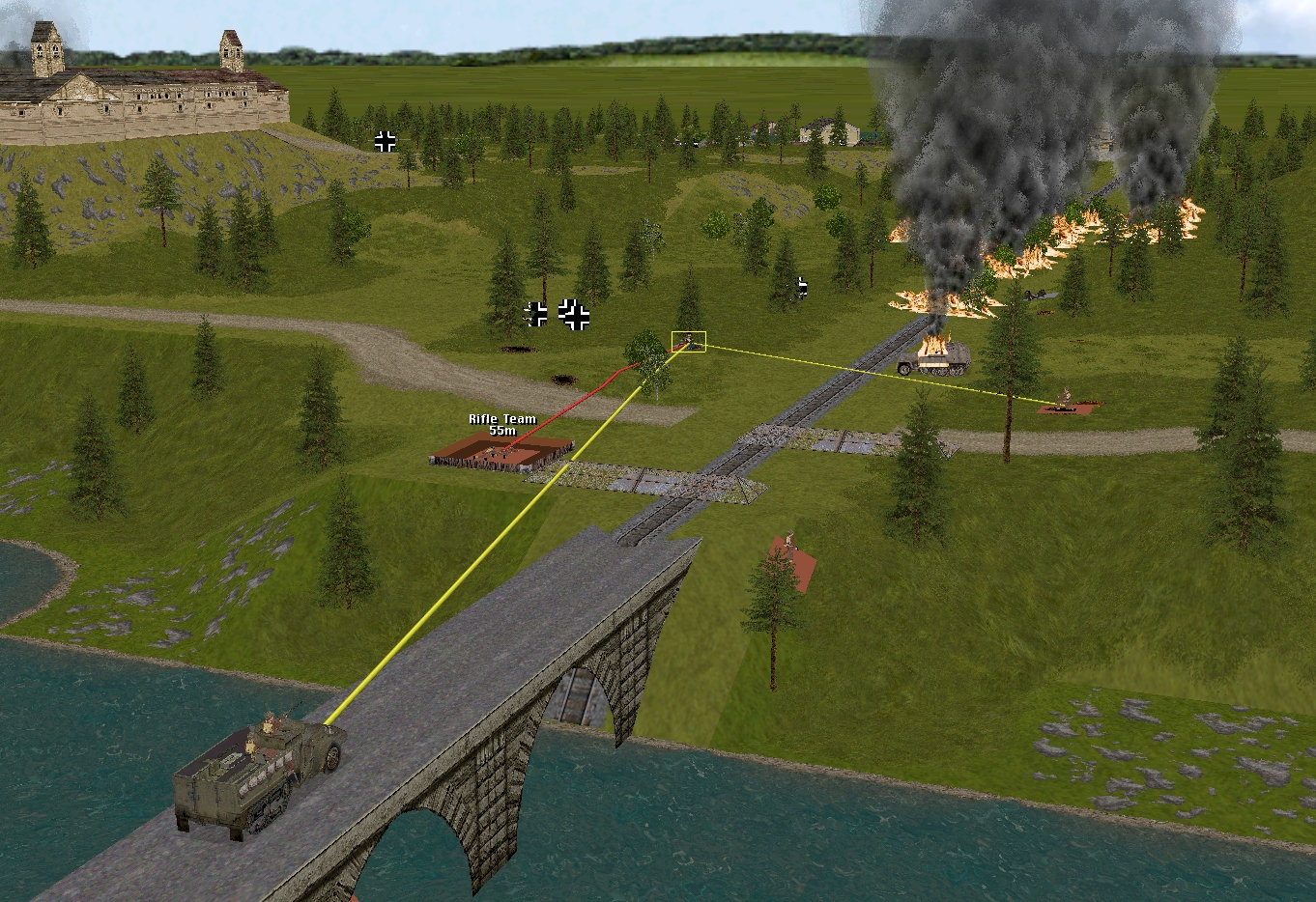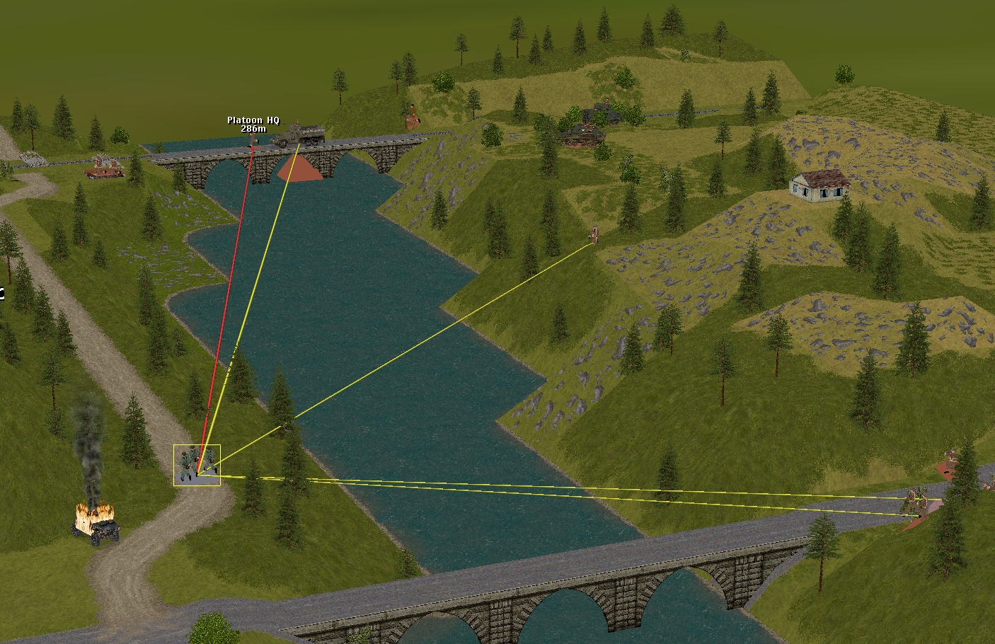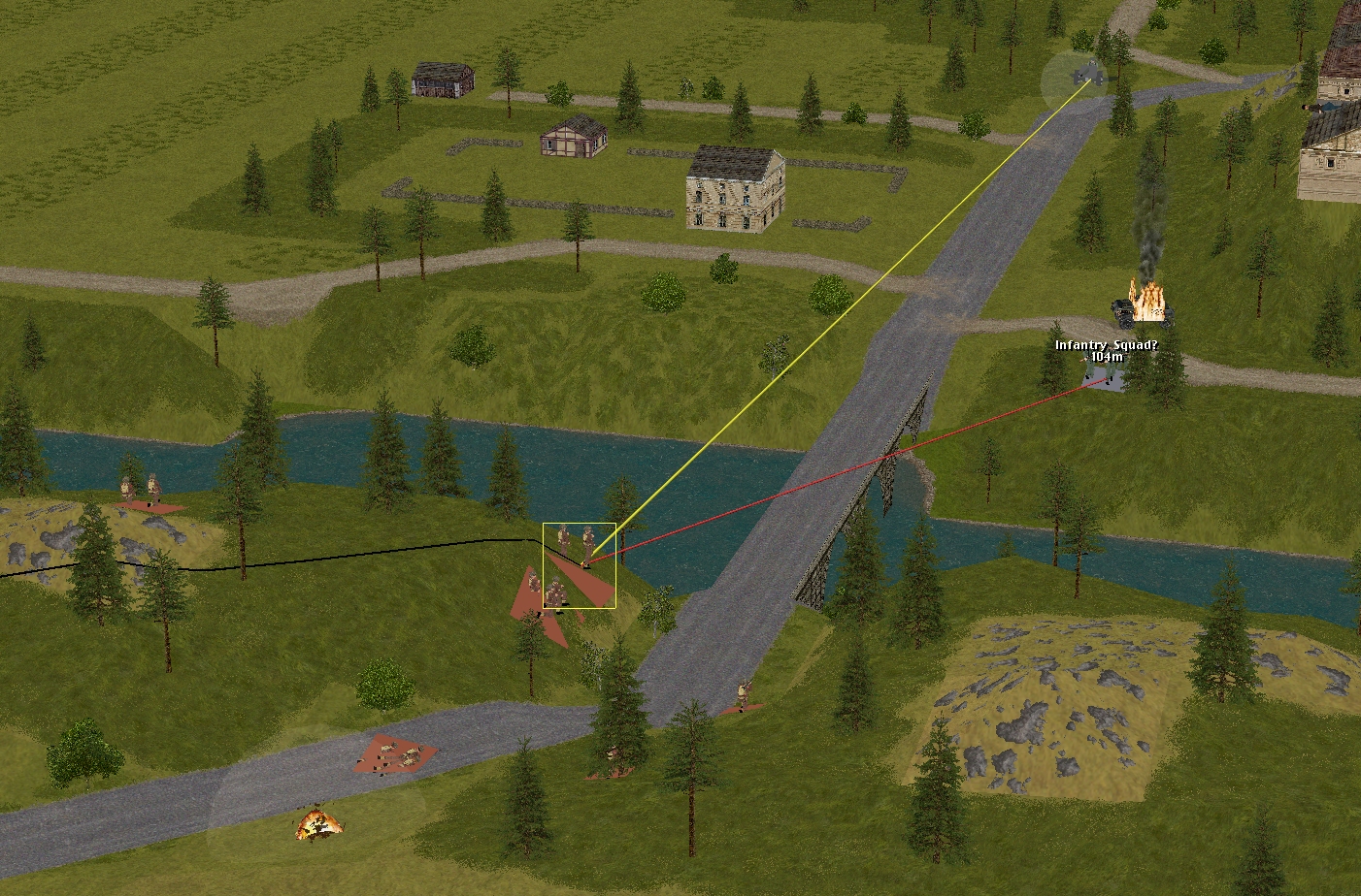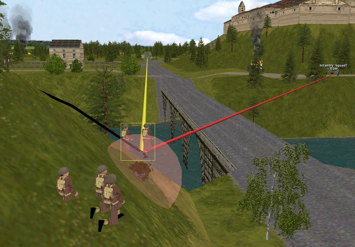 In the vicinity of the road bridge things begin to kick off at T+25 when a Volksgrenadier squad emerges from the woods close to the crackling Humber.