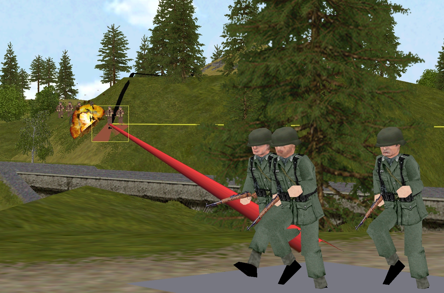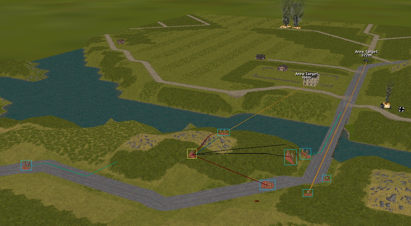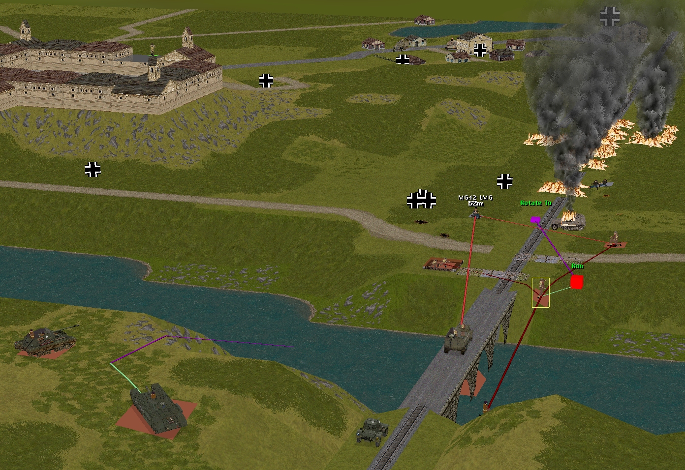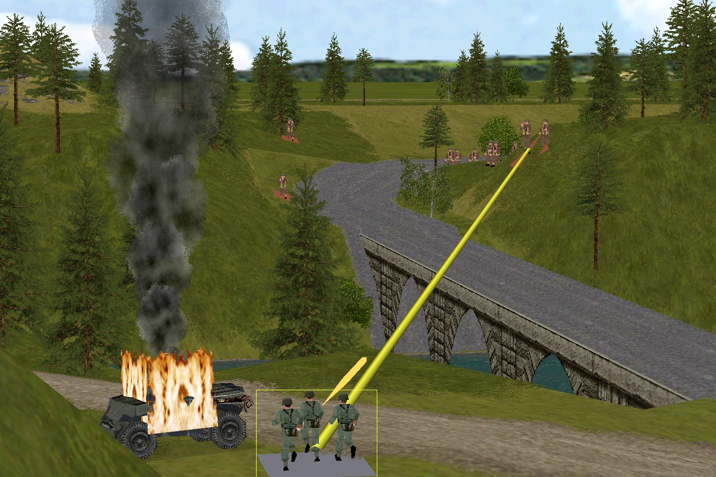 In the vicinity of the road bridge things begin to kick off at T+25 when a Volksgrenadier squad emerges from the woods close to the crackling Humber.