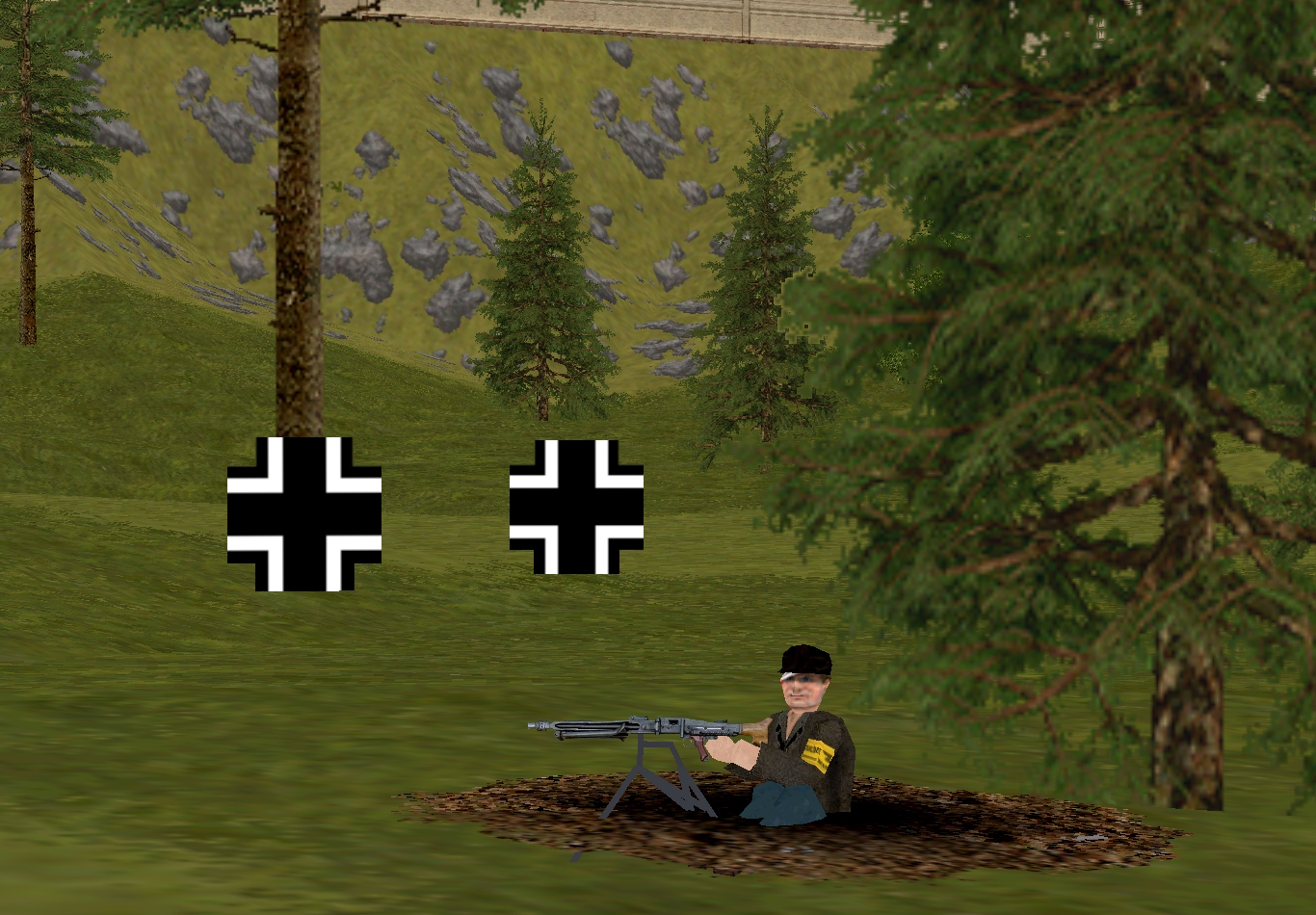 – Captain Dale’s party (Six POWs armed with pilfered rifles and pistols) + Corporal Whitehand’s team (Two POWs armed with a pilfered Panzerschreck)