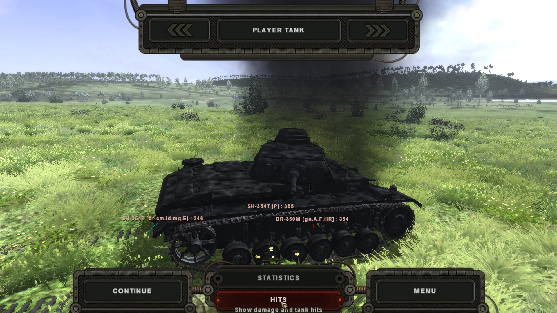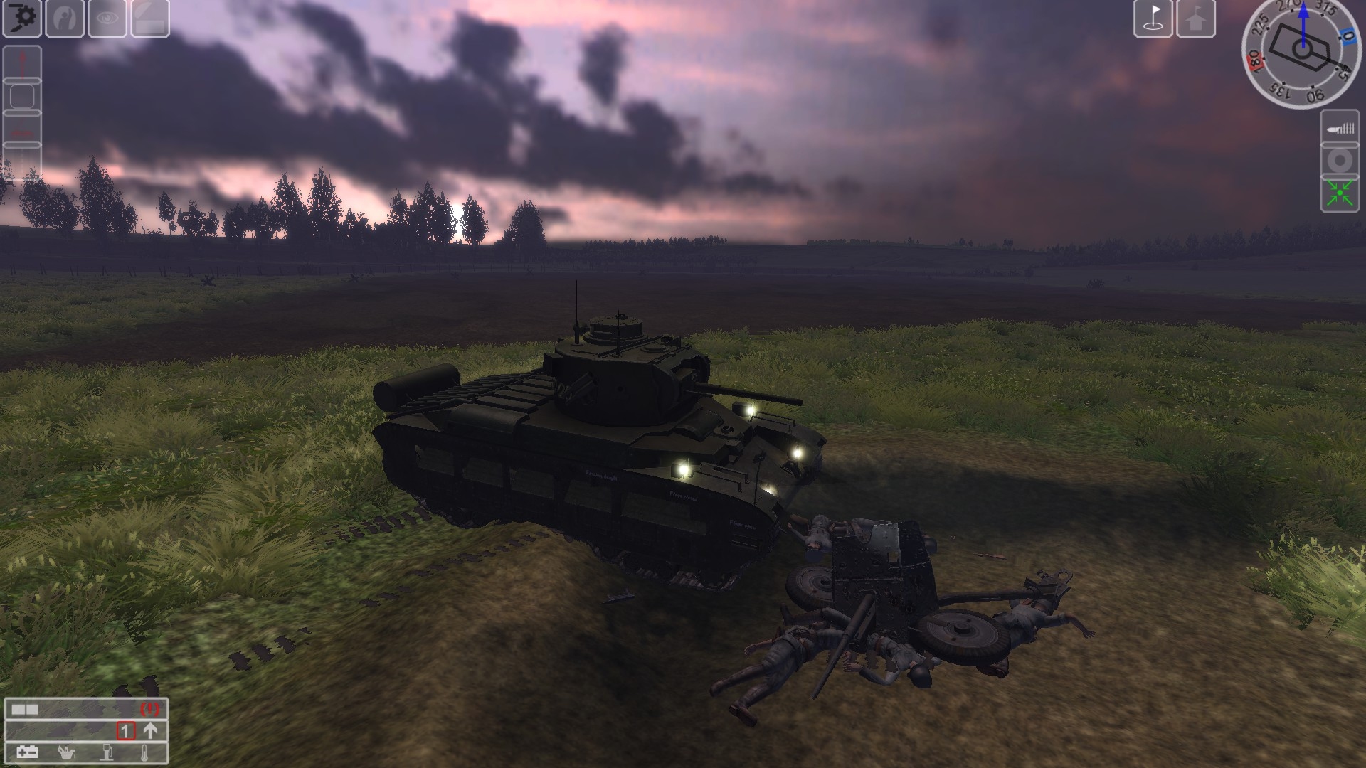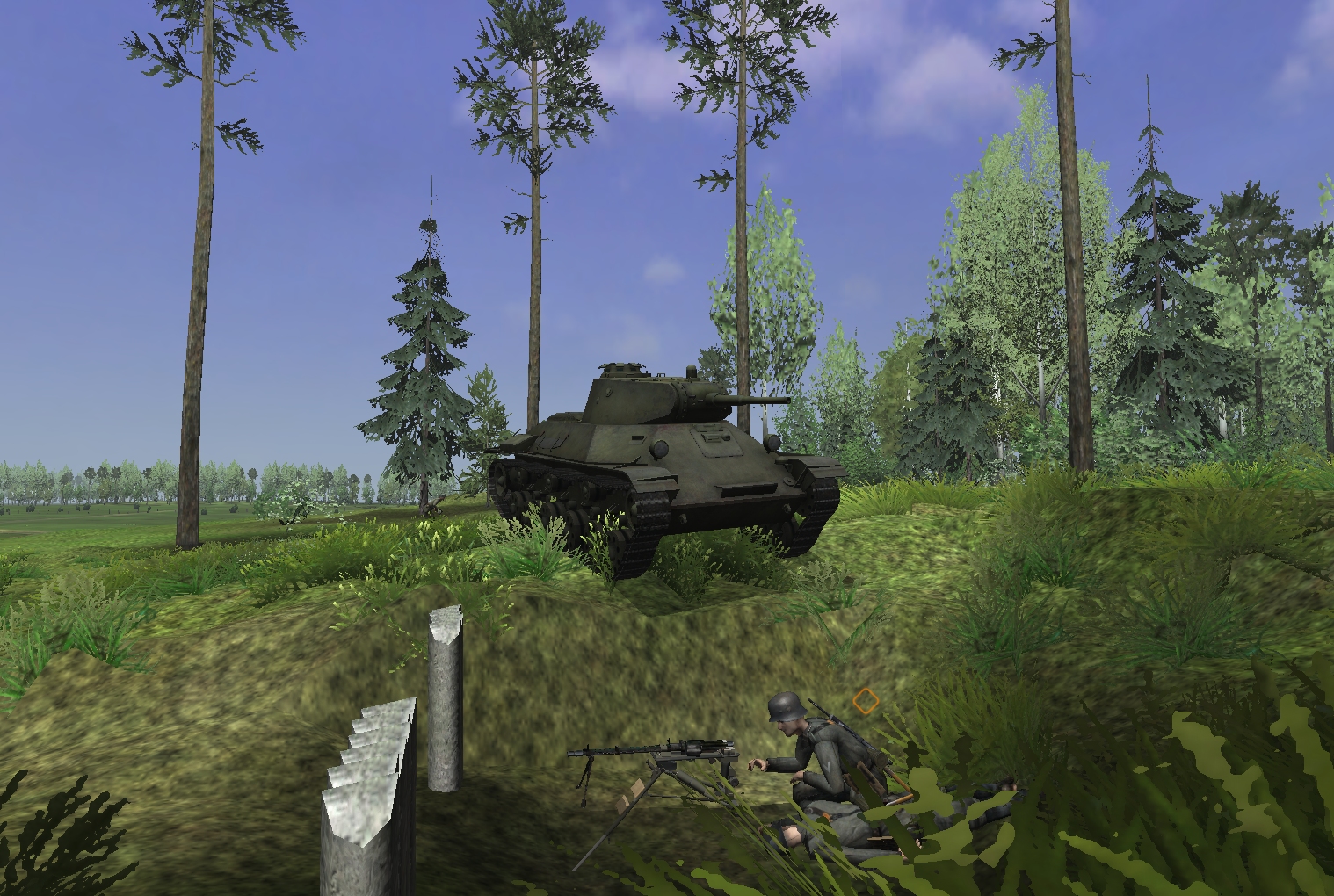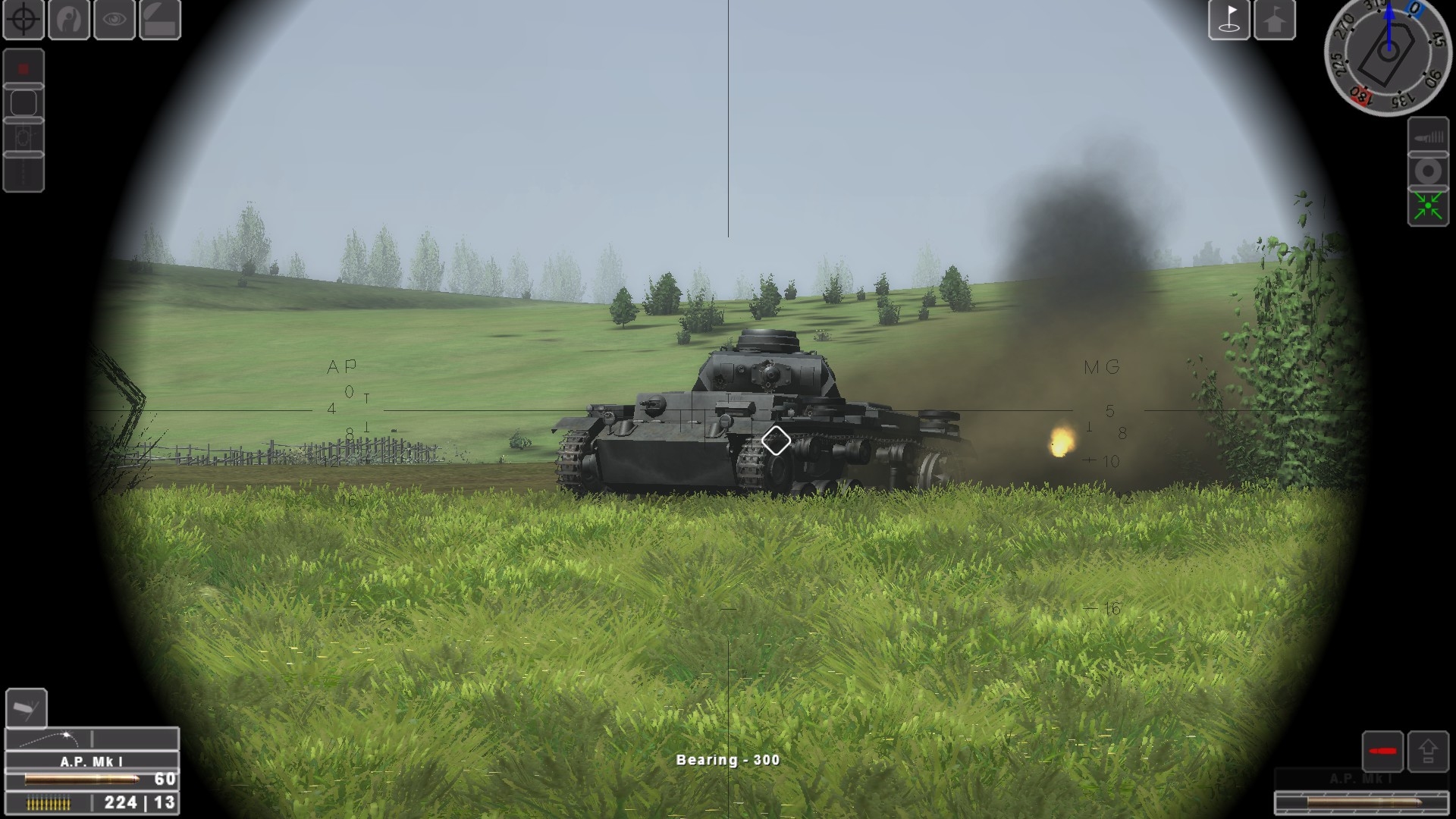 Anti-tank gun in the trees at eleven o’clock! After requesting a short halt, you hose it with the coax, then follow up with an HE round. The MG nest that comes into view as you crest the next rise gets the same treatment.