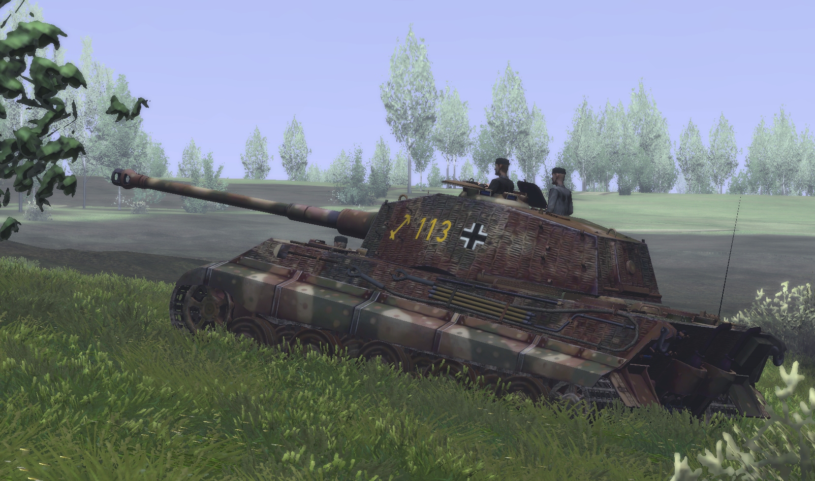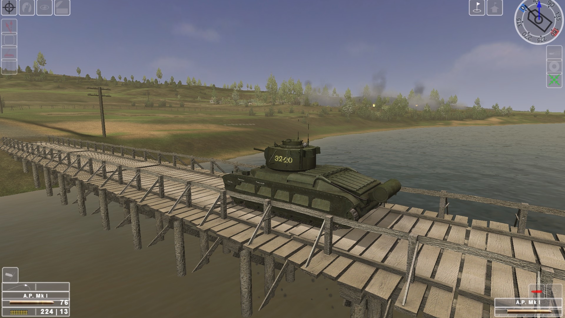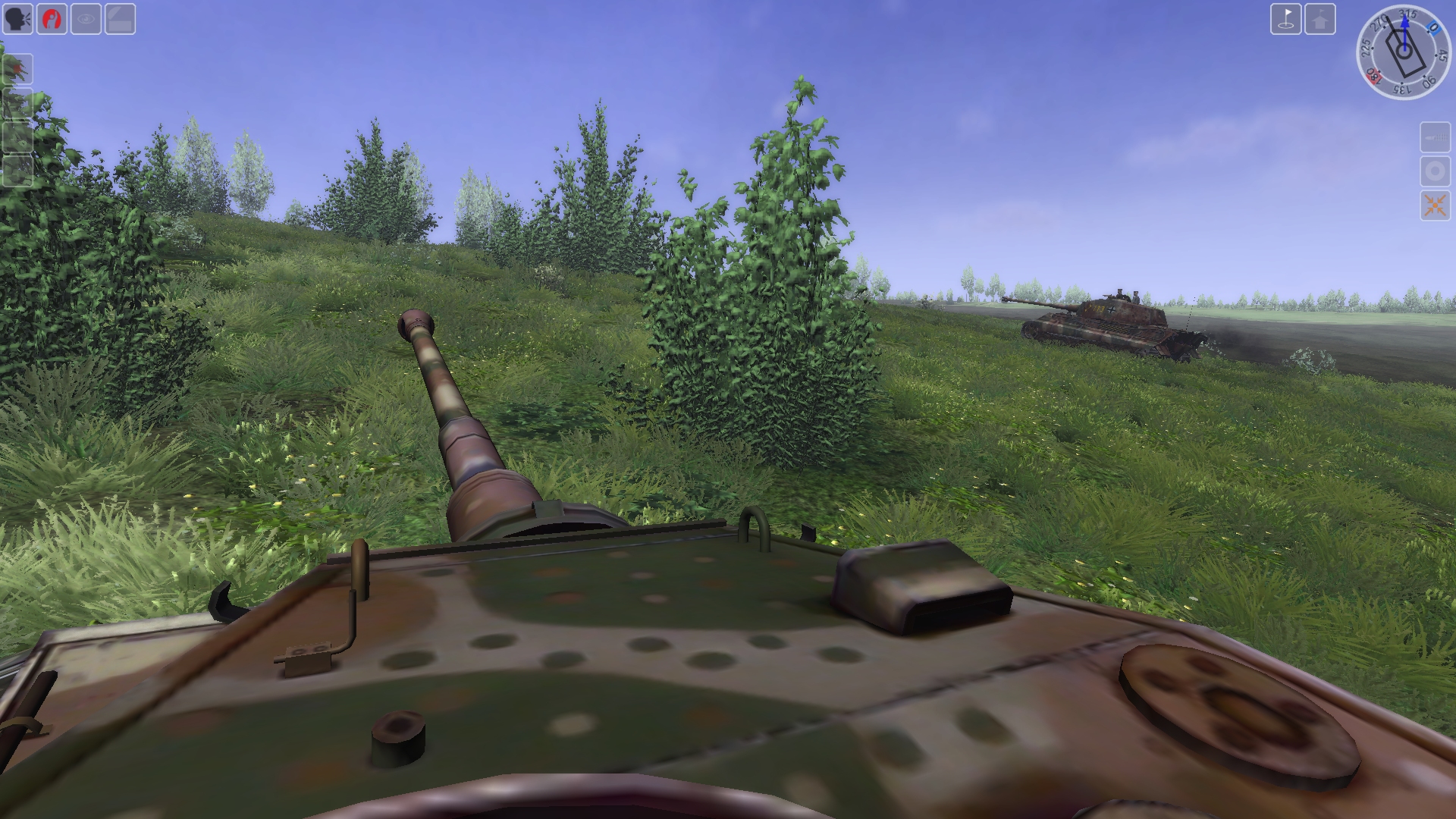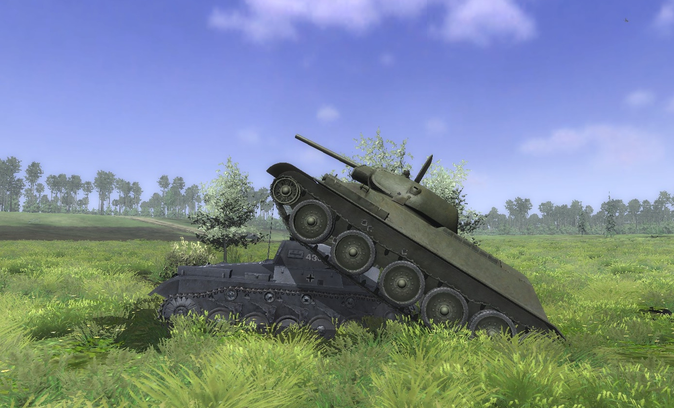 Anti-tank gun in the trees at eleven o’clock! After requesting a short halt, you hose it with the coax, then follow up with an HE round. The MG nest that comes into view as you crest the next rise gets the same treatment.