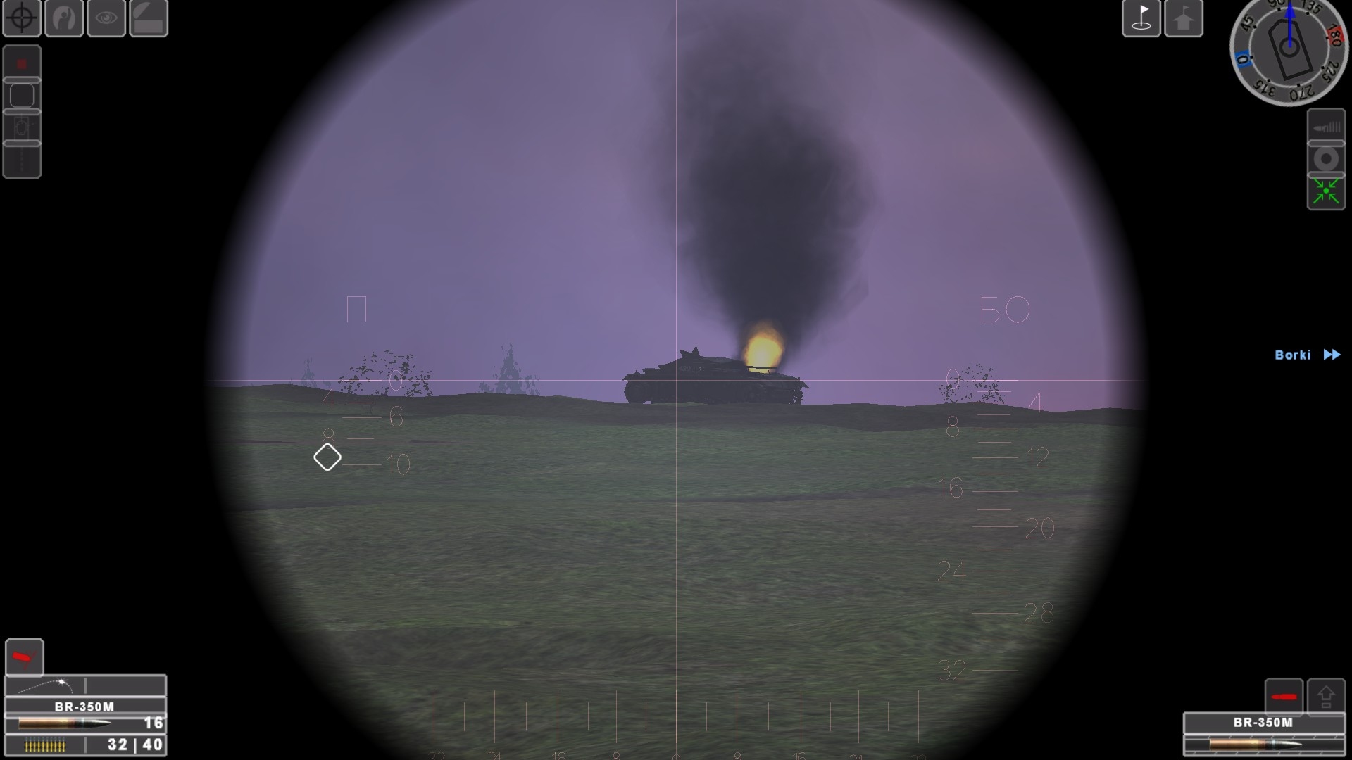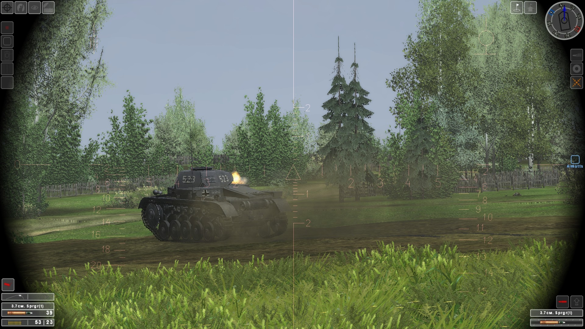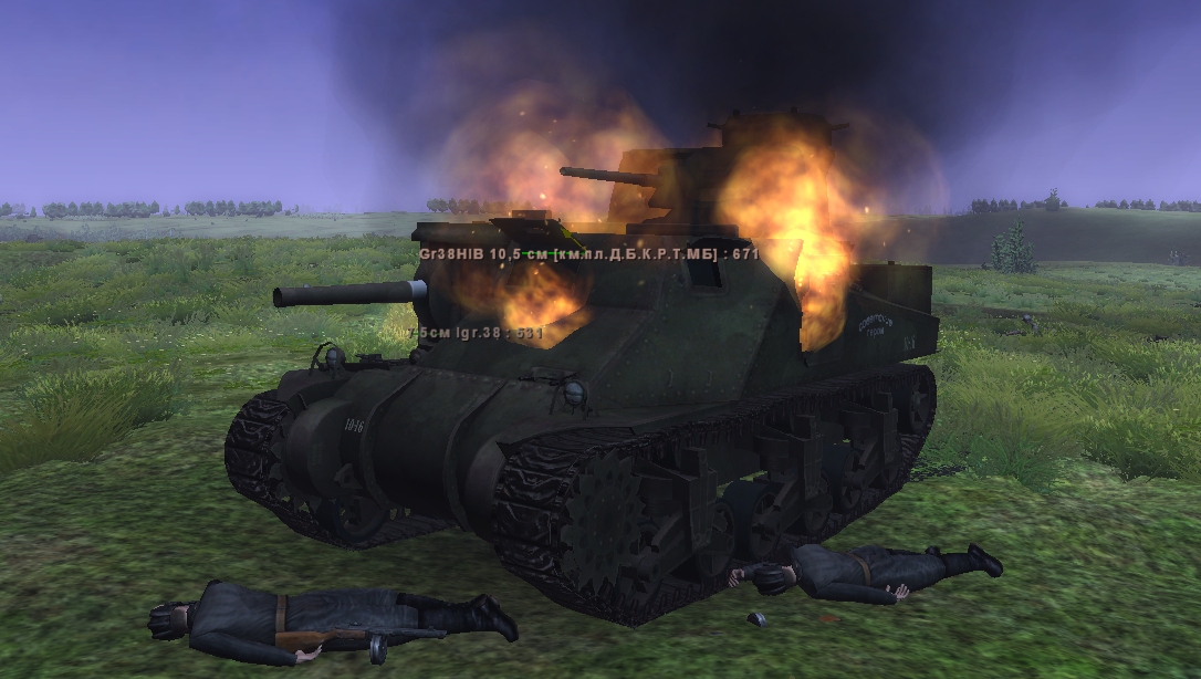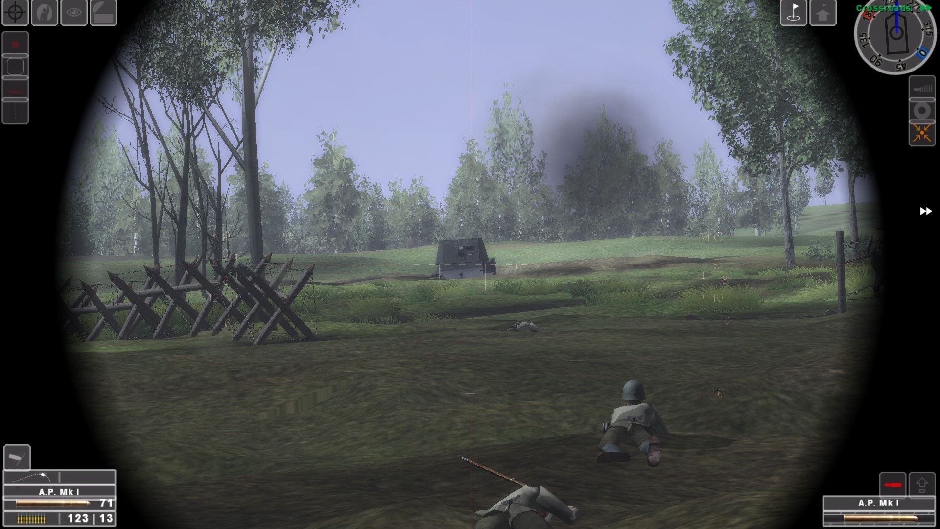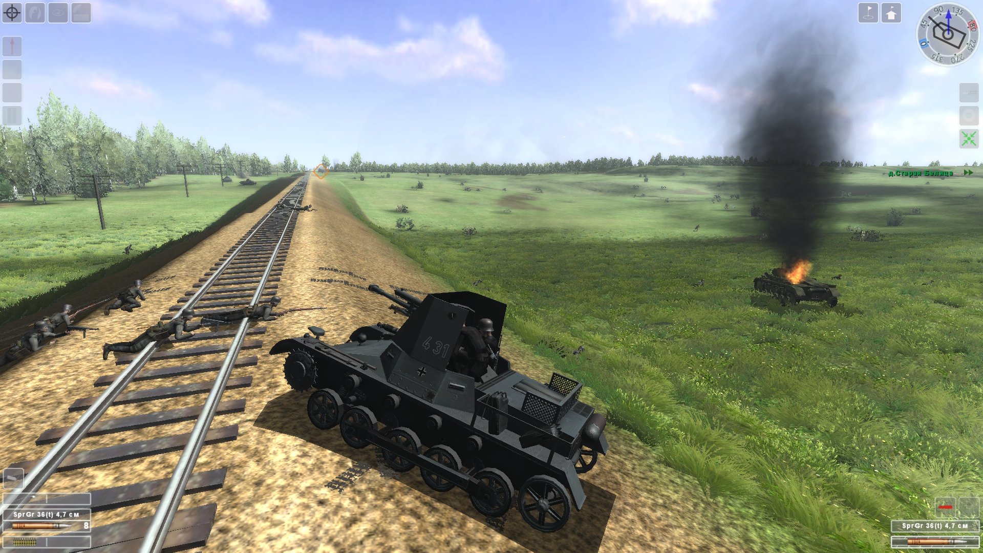 Anti-tank gun in the trees at eleven o’clock! After requesting a short halt, you hose it with the coax, then follow up with an HE round. The MG nest that comes into view as you crest the next rise gets the same treatment.