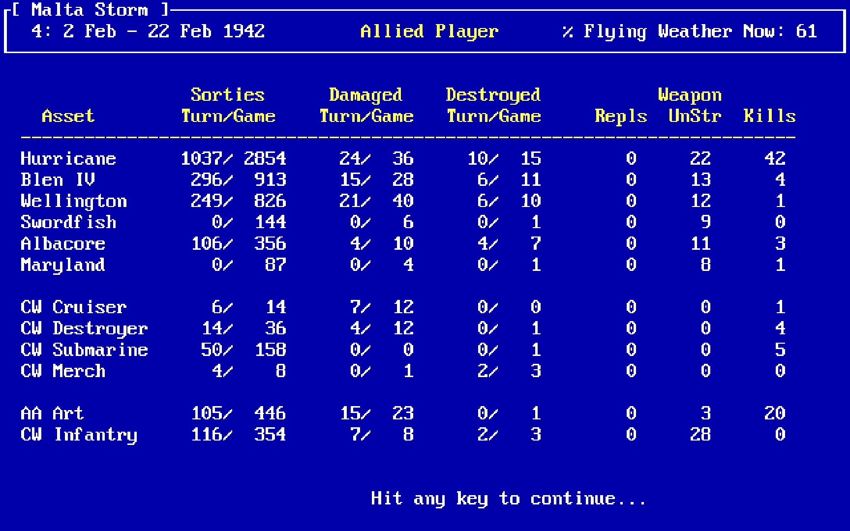 Robert: Ah, Malta Storm by SimCan in 1989. I had a huge interest in military history by the time I got into university, and was particularly interested in the Eastern Front, but also the Desert War in North Africa. (Well, those and Normandy in 1944. Plus the Pacific WW2, and also some Napoleonics.) I had read about the planned Axis attack on Malta in early 1942 and was intrigued by the thought of the air, ground and naval aspects for both attacking and defending it. It was a sustained, multinational, multi-domain operation for both sides that had boundless what-if possibilities. Stephen Newberg at SimCan was very encouraging, and so I stopped fiddling with Eastern Front possibilities and got serious about creating a releasable game. This was after perhaps 10 years of hobby efforts meant to improve my programming skills more than anything. Malta Storm was indeed my first commercial release and one of three I did for Simulations Canada.