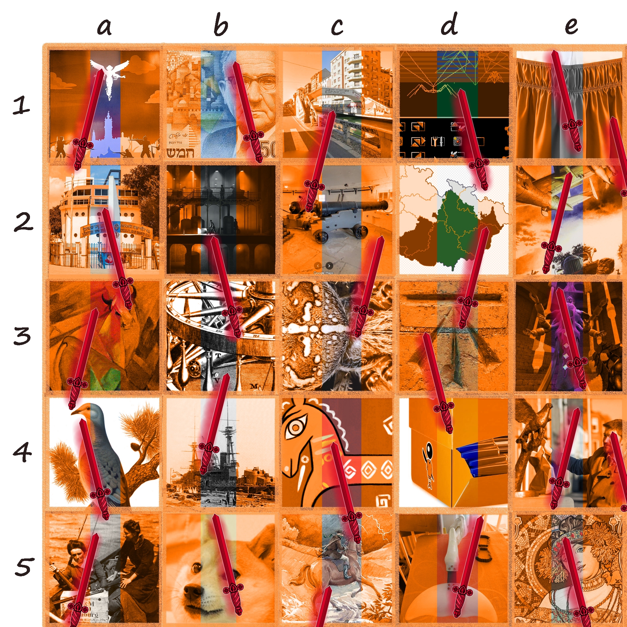 The ‘cluster foxer’ is regarded by some as the most demanding form. Solving one involves identifying 25 pictures and five hidden themes. The enlargeable mosaic below consists of five interlocked picture clusters (some possible cluster arrangements are shown above) each with its own theme. Themes have nothing in common with each other. Don’t be surprised to find, for example, “Crocodiles”, “Tulip mania”, “Words beginning with “ter””, “1948” and “Fictional policemen” sharing a puzzle. A picture’s connection to a particular theme won’t always be literal. An image of the Brandenburg Gate is just as likely to be part of a “Bach” cluster as a “Berlin” one.