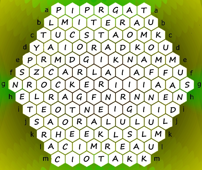 The honeycomb below is a fancy form of wordsearch in which every cell is used, and words can curl and zigzag but never overlap. Each hive foxer has a theme (some past ones: owls, rugby, Egypt, UFOs…). Identifying the theme is a vital part of the defoxing process.