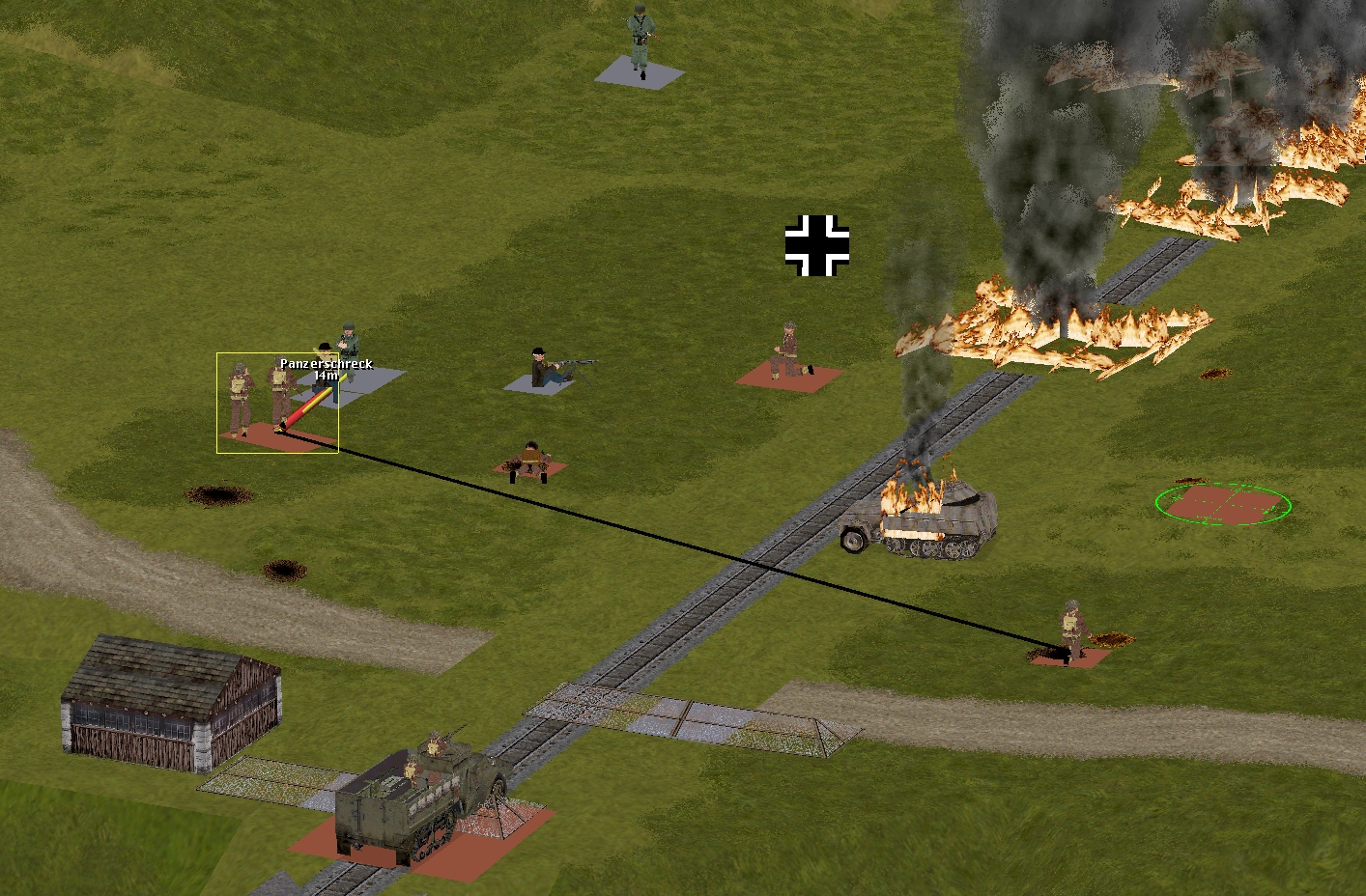 – Captain Dale’s party (Six POWs armed with pilfered rifles and pistols) + Corporal Whitehand’s team (Two POWs armed with a pilfered Panzerschreck)