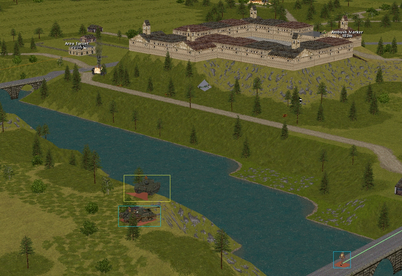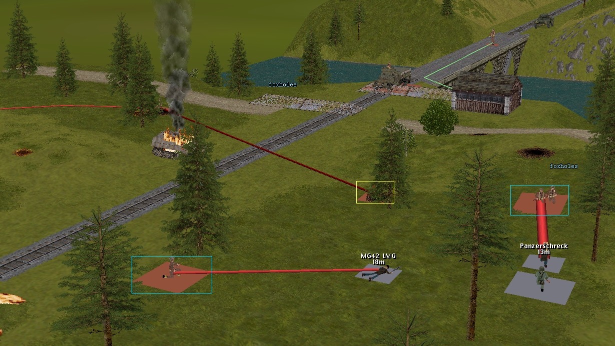 Beyond Overlord’s admirably self-reliant silicon CO is, I reckon, handling the situation at the railway bridge particularly adroitly. Having been evicted from positions close to the riverbank, the battered defenders have retreated a short distance into the woods. Out of sight of the heavy-hitting Churchill and Archer, and the cautious M5A1, their task is considerably easier.