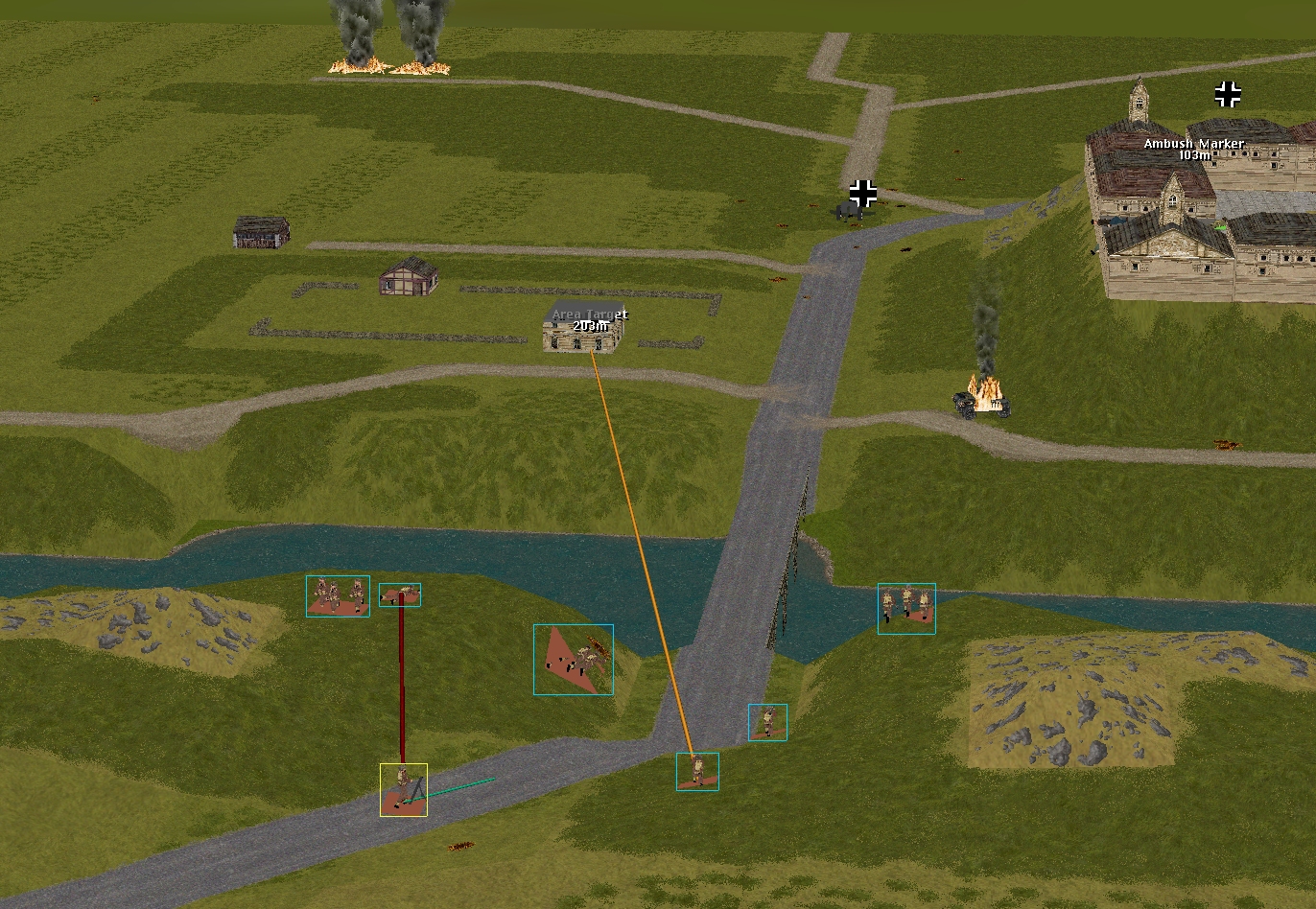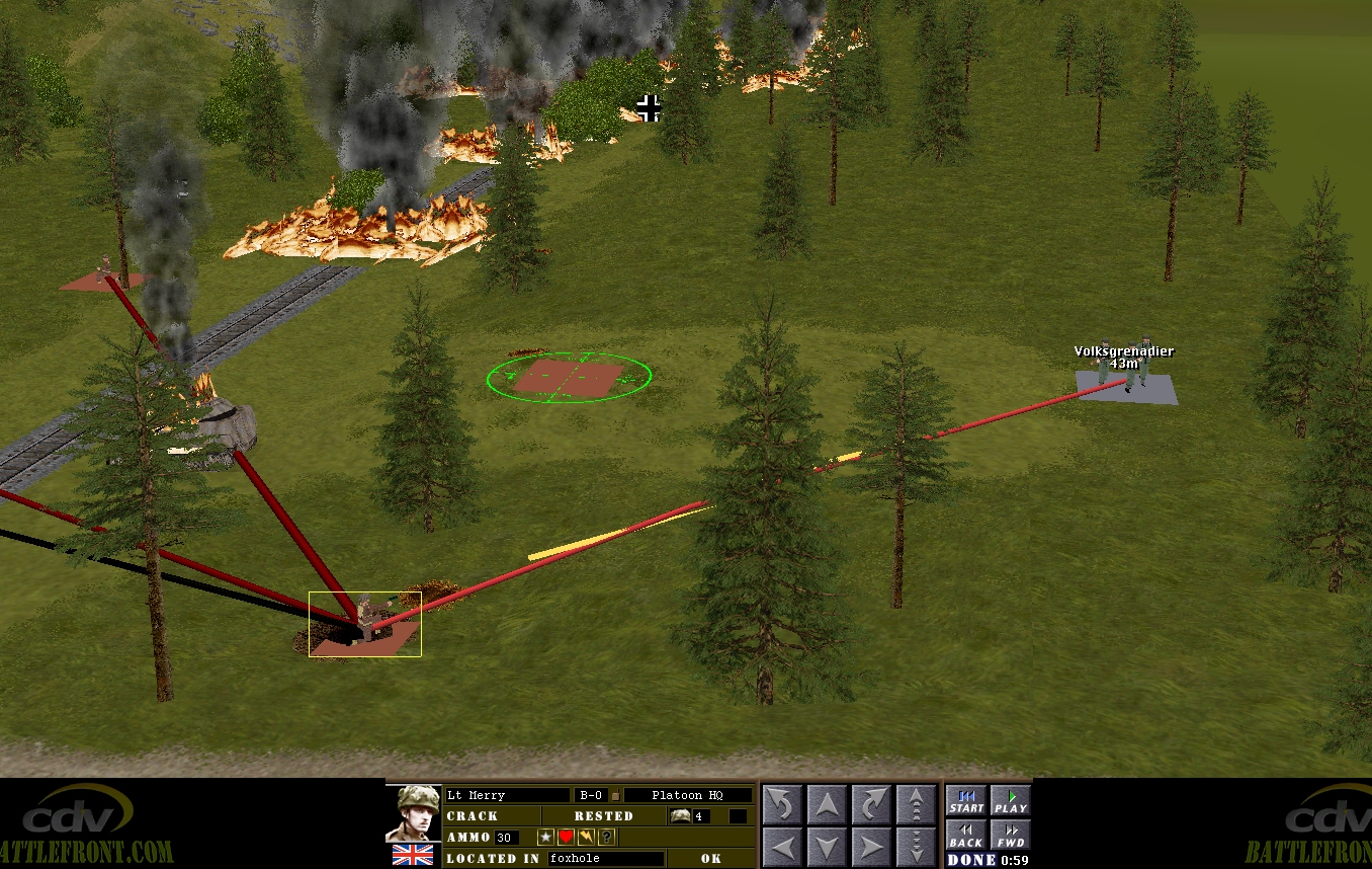 Distracted by the fighting just north of the railway, the Brits have few assets available to fight off a counterattack developing to the south of the line. Midway through the sixty a squad of eight Volksgrenadiers cannily hugging the forested southern map edge, moves into Merry’s LoS. Can the foxholed Lieutenant and his three companions, repulse them without assistance? Perhaps Captain Hood, halfway across the bridge when the clock stops, could help out.