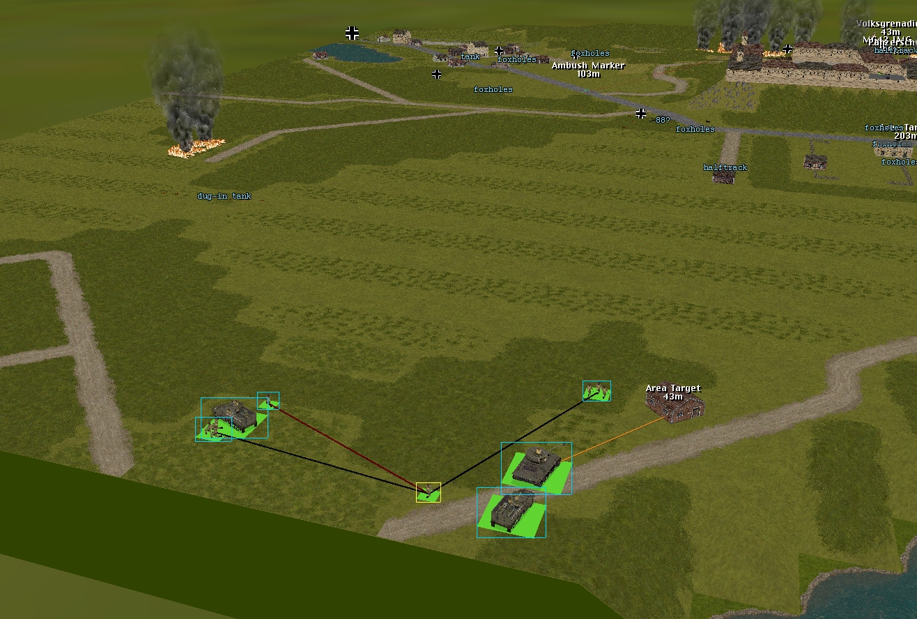 The US units that arrived last turn begin exploring their wooded surroundings this sixty. Engine limitations (in CMBO, squads can’t disembark and split in the same turn) mean some orders don’t get executed, but it’s a start.