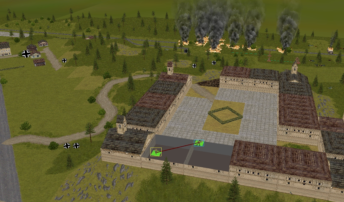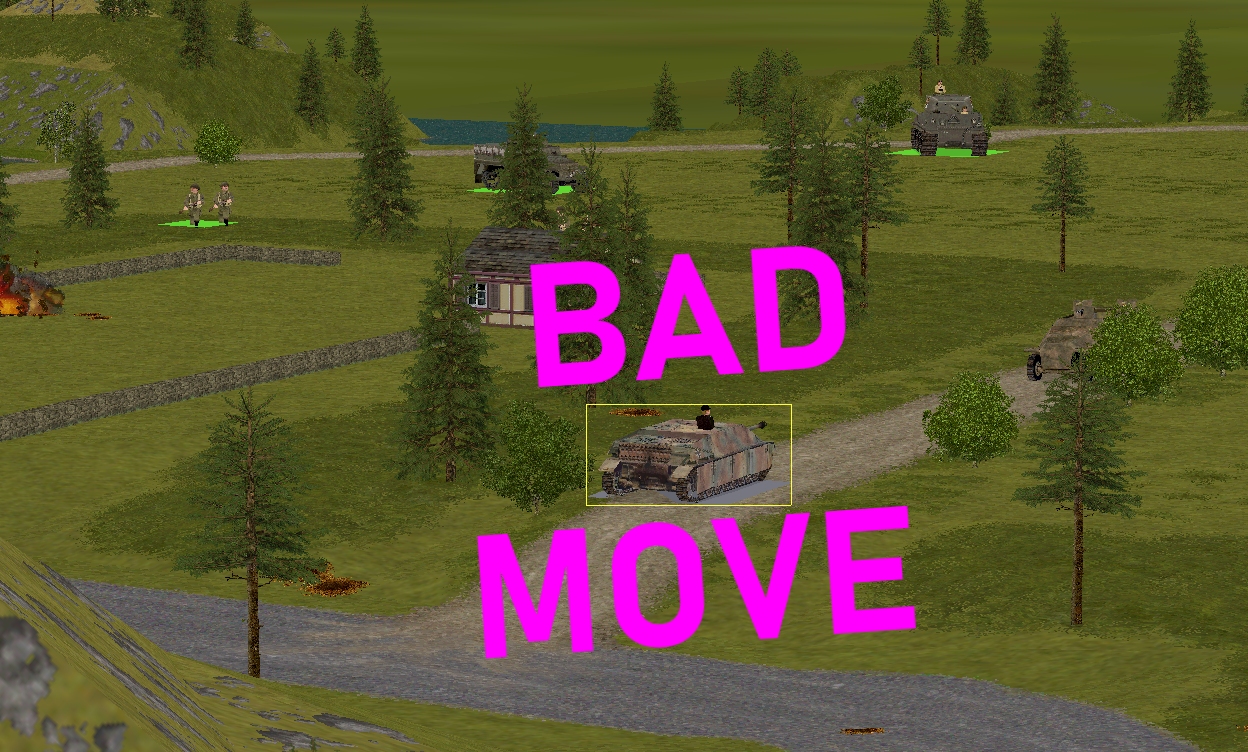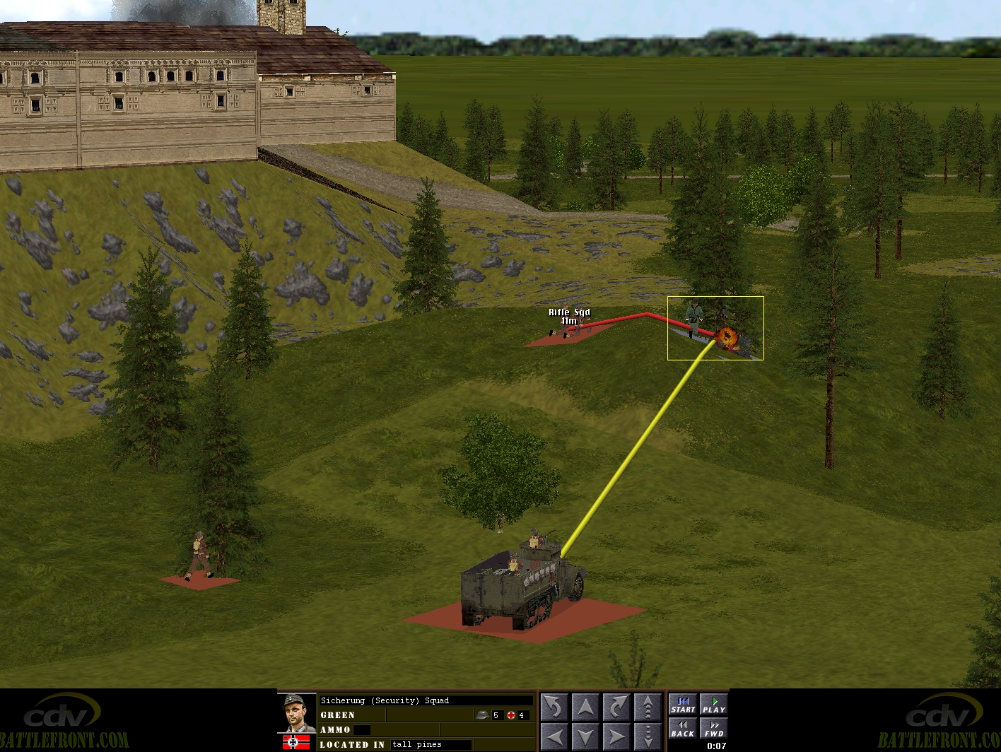 The focus of screenshot #3 is the Jagdpanzer IV. Possibly spooked by the aggressive advance of Sergeant Pyle’s Sherman, the German TD decides to reverse fairly early in the turn.
