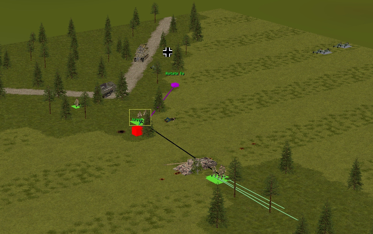 Many of Costner’s Yanks swap one stand of conifers for another. During the dash past the KOed Panther, none of the sprinting GIs take fire, the enemies in the field to the NE being too focused on retreat, first aid, and bleeding out to engage.