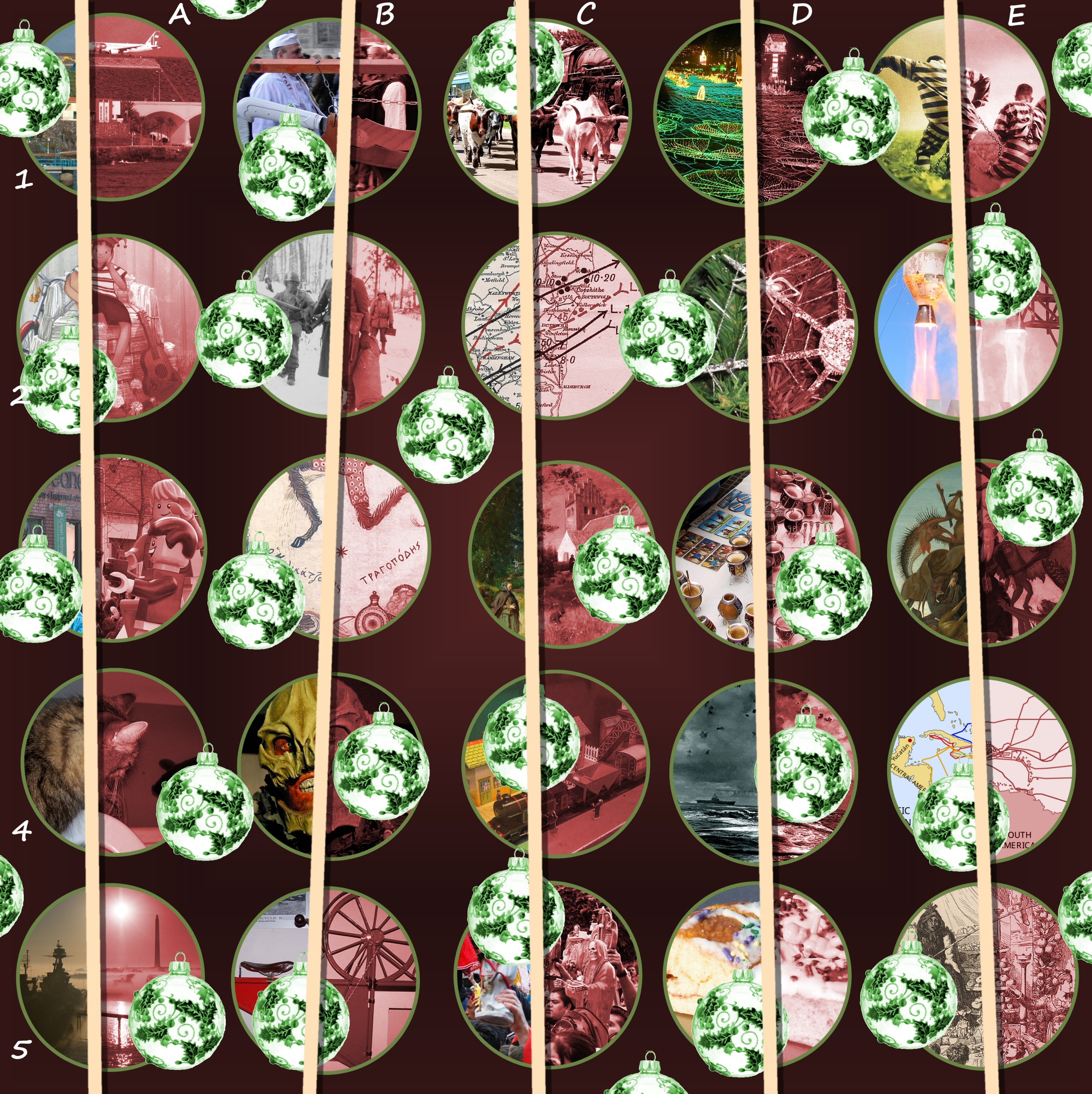 Each pic in this foxer is taken from a Wikipedia page that includes the word ‘christmas’, ‘santa’, or ‘holly’ somewhere* in its text. To fully defox the puzzle, supply Roman with a list of all 25 Wikipedia pages.