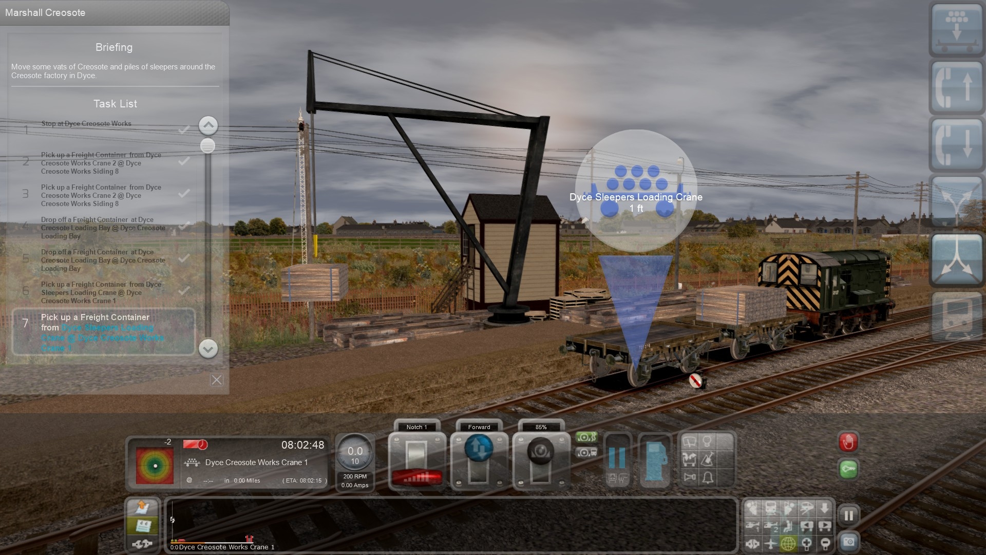Click-triggered crane animations and cattle loading adds extra interest to shunting tasks. In the above image I’m loading freshly soaked sleepers at Dyce Creosote Works.