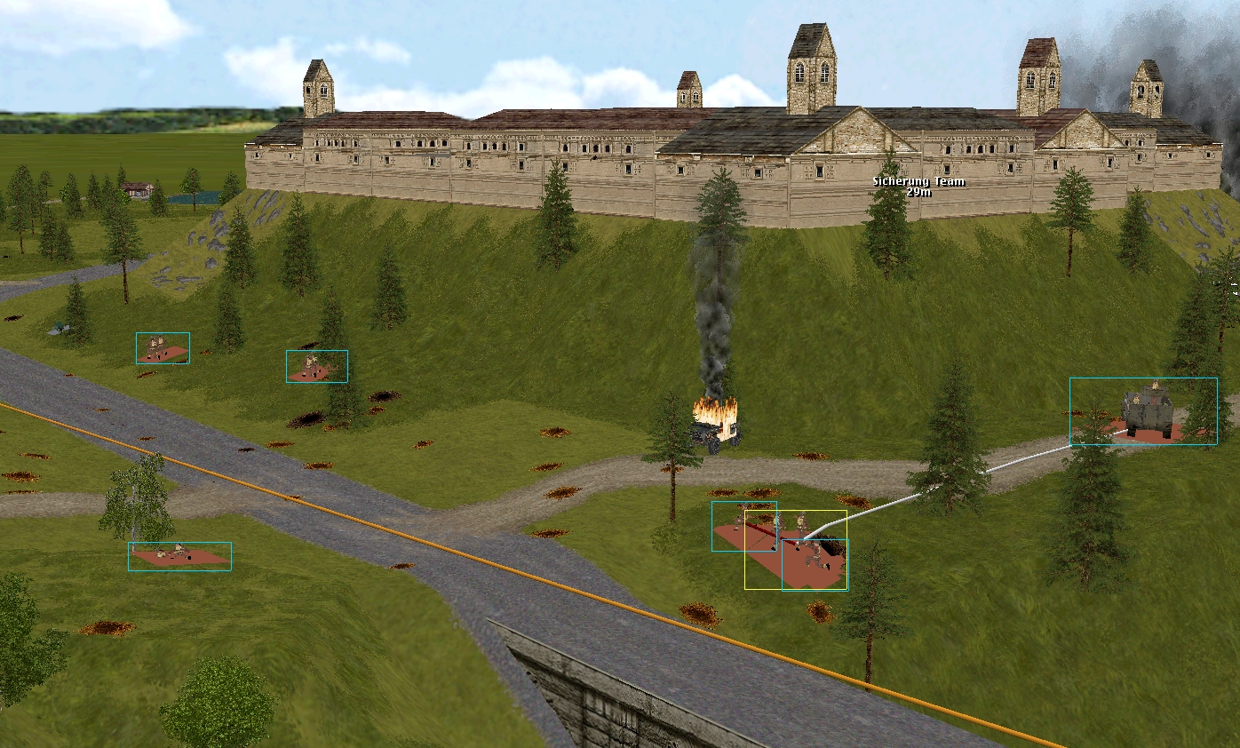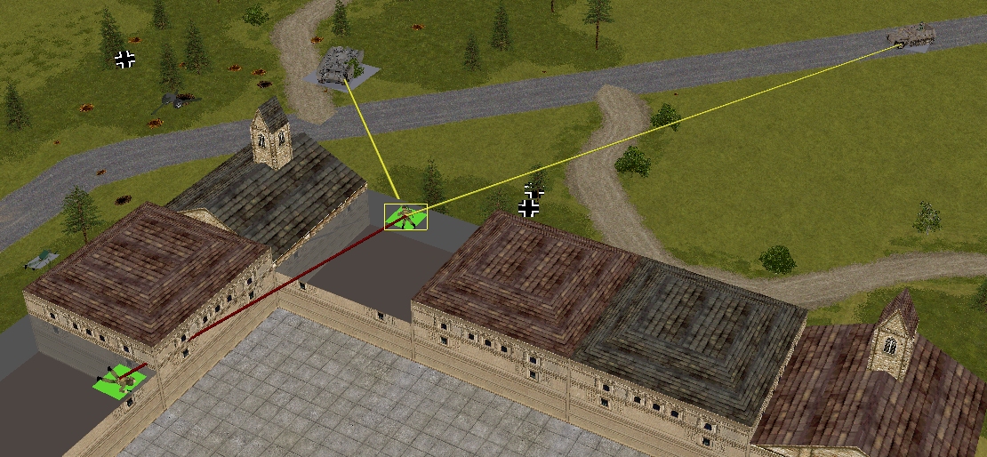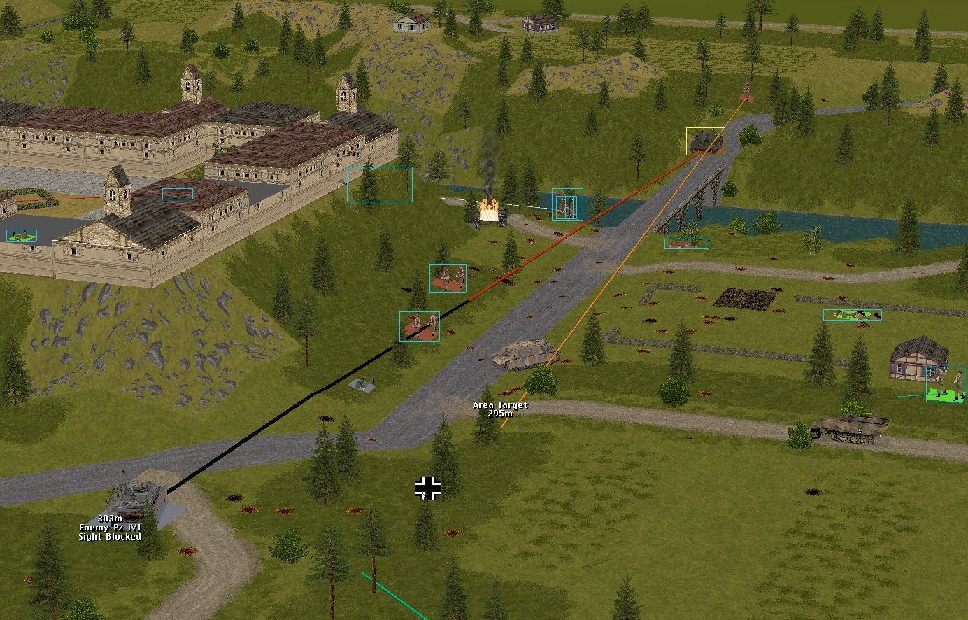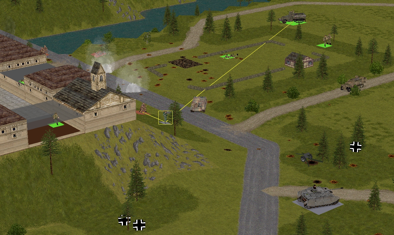 Happily, it’s not all bad news south of the Schloss. Between them, Forester’s teams and the Churchill neutralise a three-man Volkssturm unit that fails to withdraw with sufficient haste, and send another battered remnant (indicated by a Balkenkreuz in the above image) haring towards the eastern map edge.