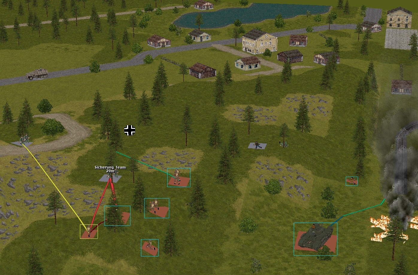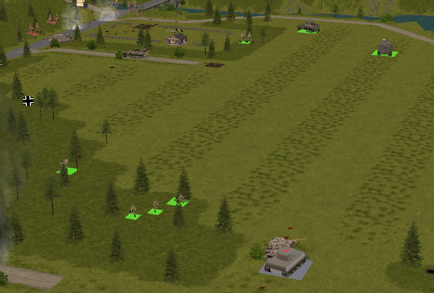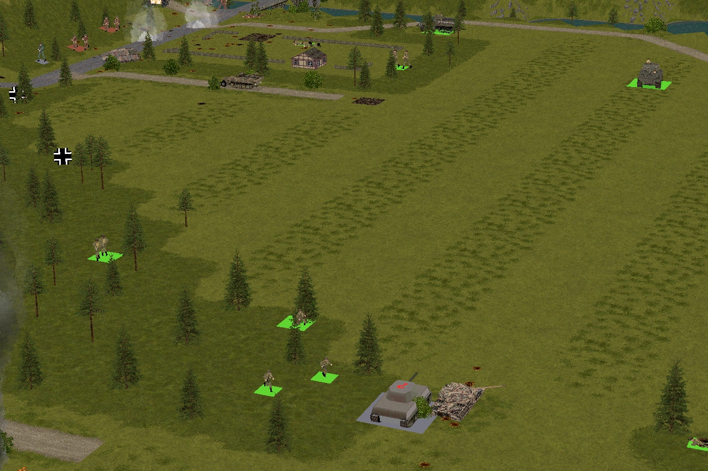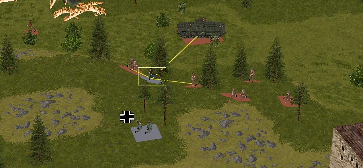 Happily, it’s not all bad news south of the Schloss. Between them, Forester’s teams and the Churchill neutralise a three-man Volkssturm unit that fails to withdraw with sufficient haste, and send another battered remnant (indicated by a Balkenkreuz in the above image) haring towards the eastern map edge.