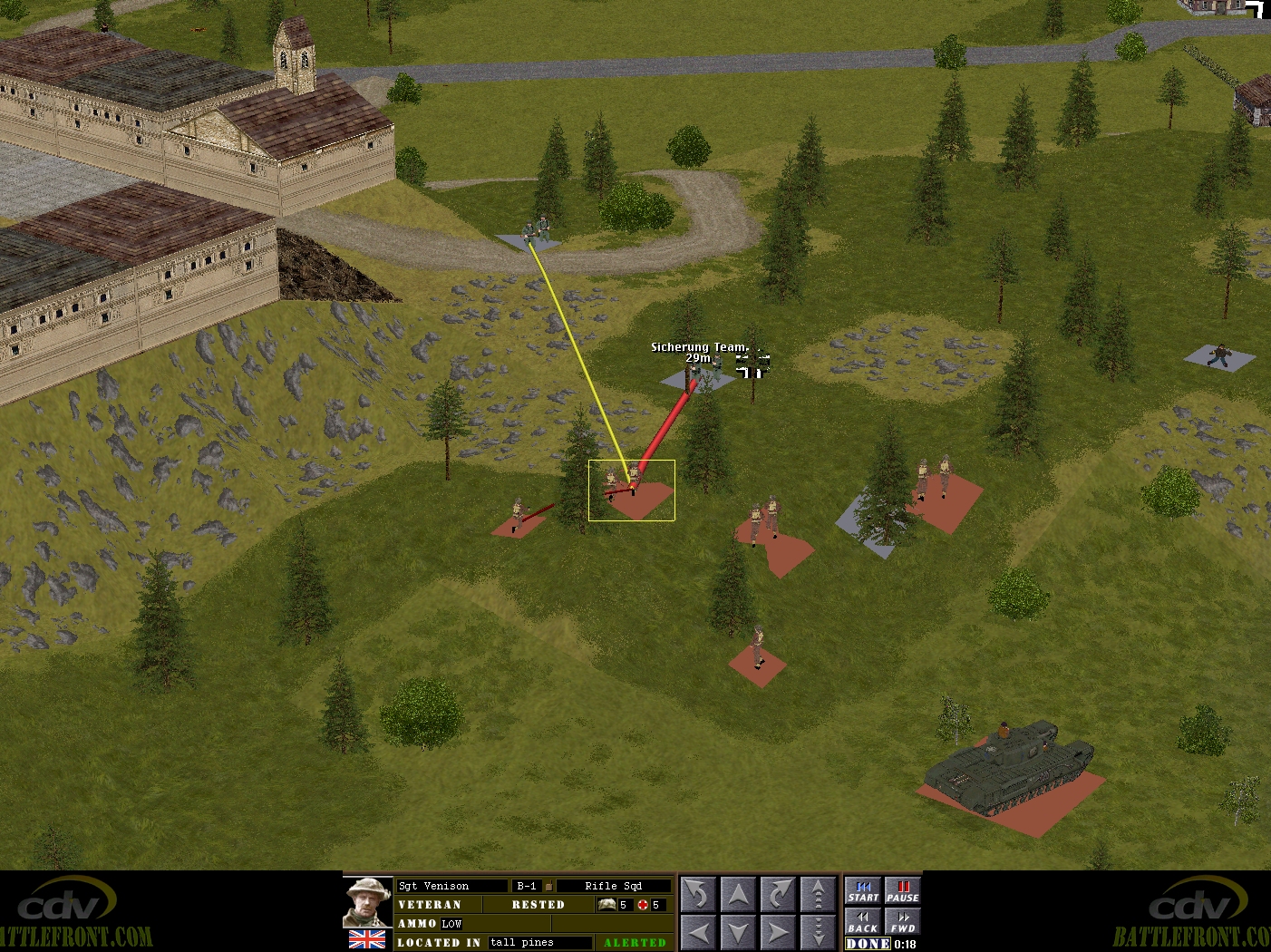 The Brits beyond the rail bridge might not have any tanks to deal with, but denuded by earlier scraps, running short on ammo, and facing two, four-man Sicherung squads (?) in the woods close to the castle entrance, their eastward advance is in serious danger of stalling. There’s eighteen seconds on the clock when one of Venison’s lads groans and hugs a tree trunk for support.