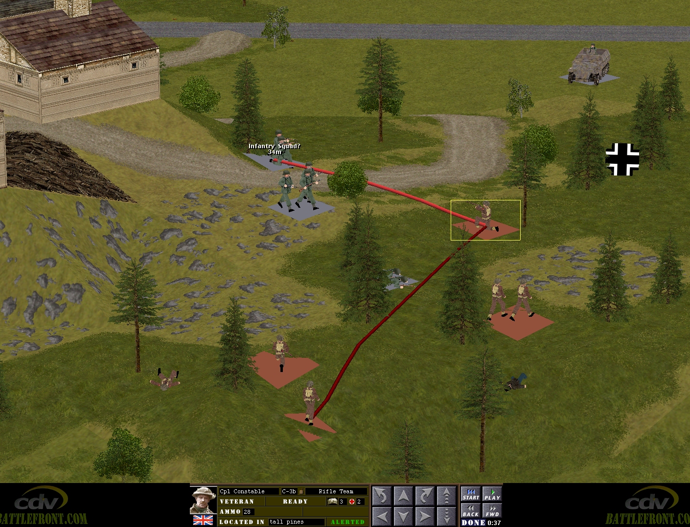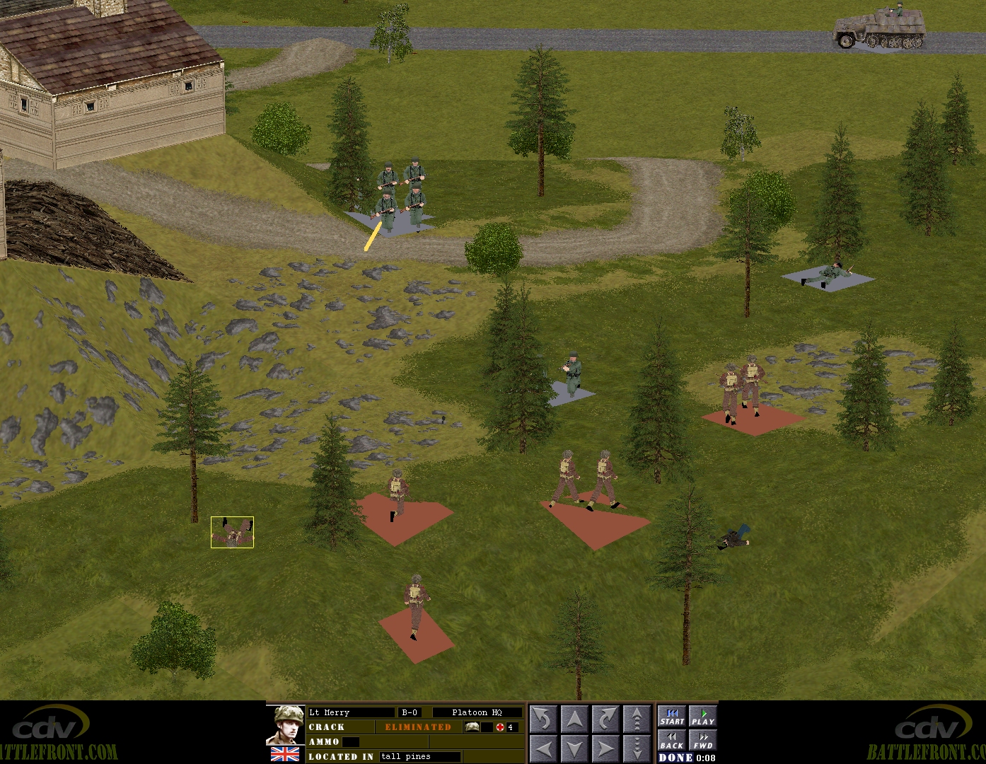 The situation deteriorates further when the 250/1 halftrack from the village, which has hurried to join the fun after losing sight of Corporal Whitehand, spots Englanders amongst the trees. By the time the clock hands halt, all of the British infantry units in the vicinity, with the exception of Captain Hood’s six-strong HQ, have been reduced to just two men.