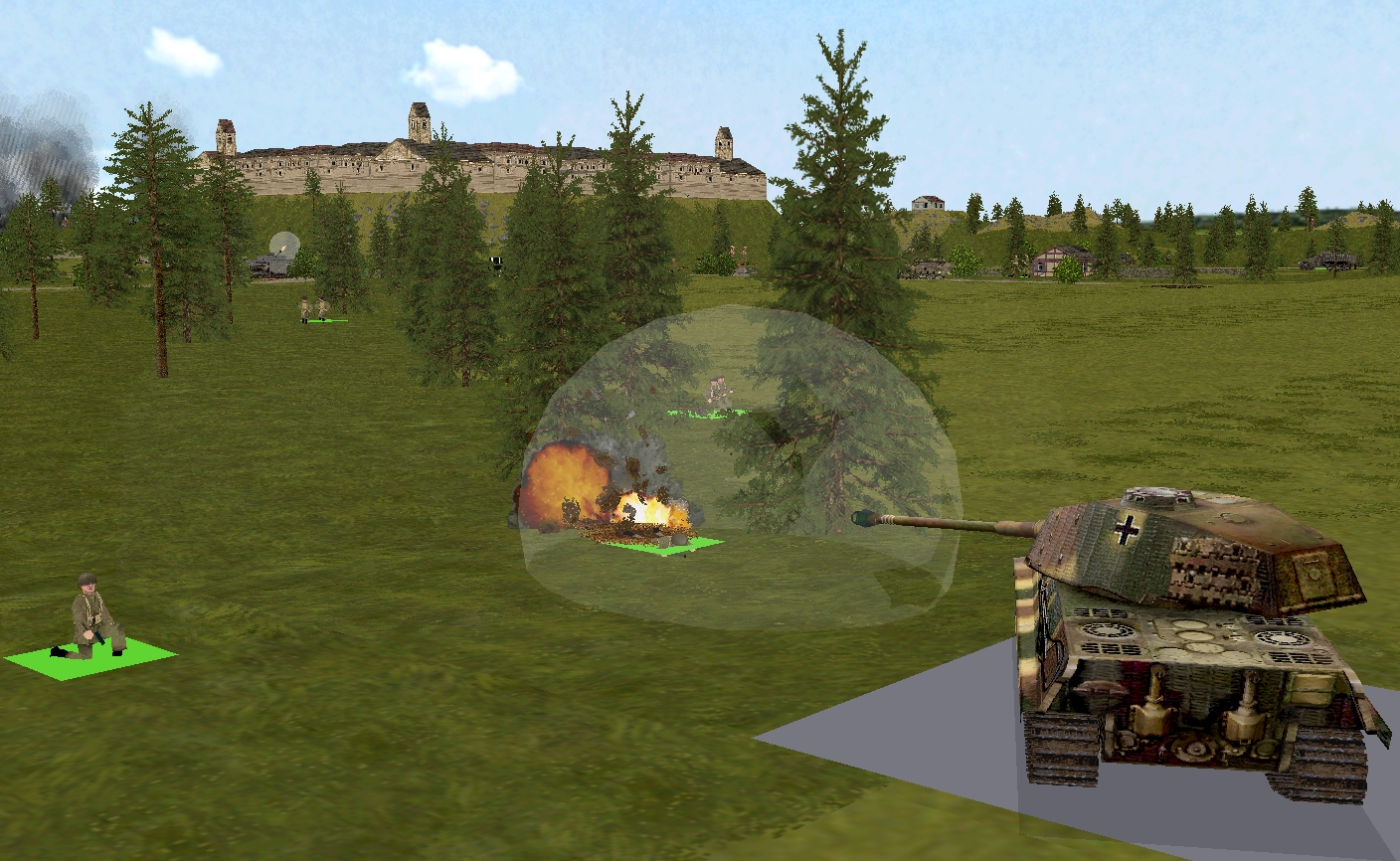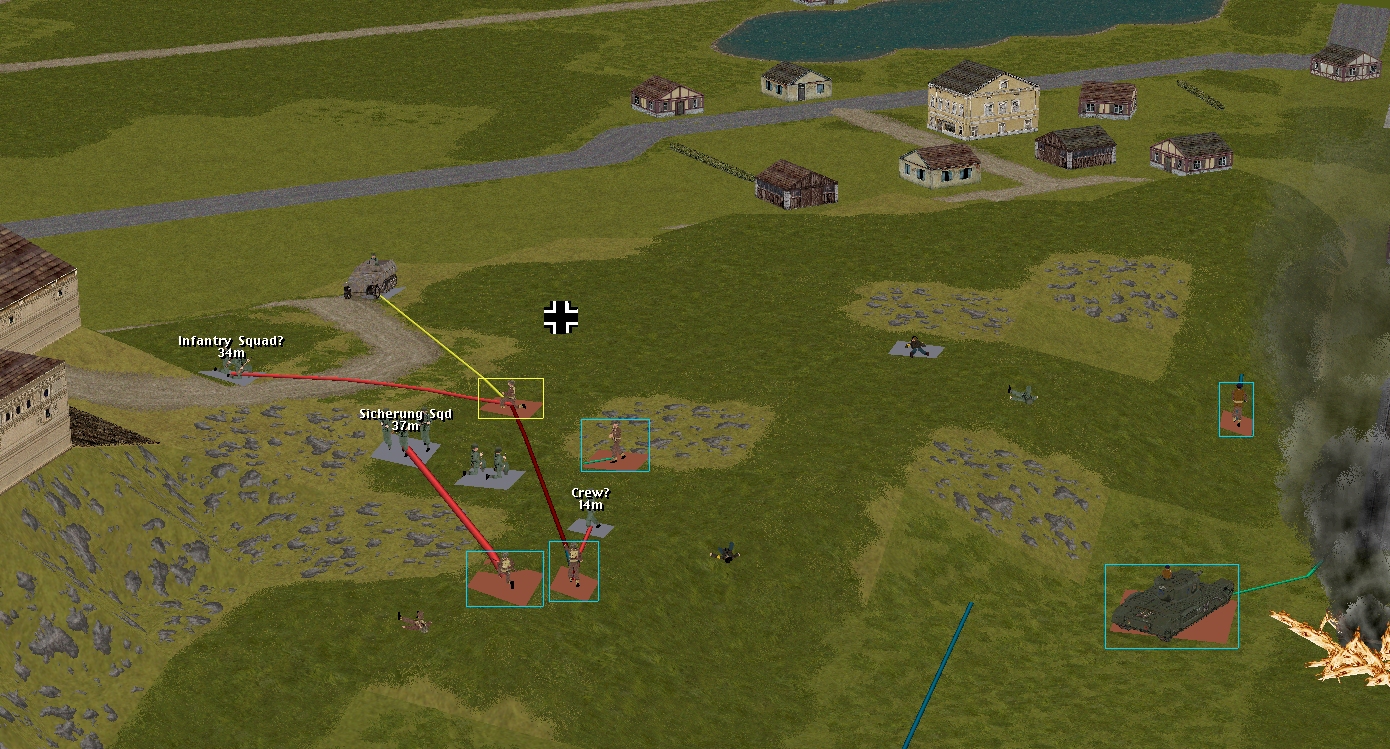 The British push is stymied by the unexpected appearance/involvement of two relatively potent enemy units. Circa T+8, a nine-man kraut security squad emerges from the greenery on the far side of the castle’s approach road. Their aggressive attitude and extra firepower (5 x Kar98k, 3 x MP 40, 1 x MG 42 LMG) quickly tip the skirmish scales in favour of the squareheads. First, Lieutenant Merry is felled by a flurry of incoming.