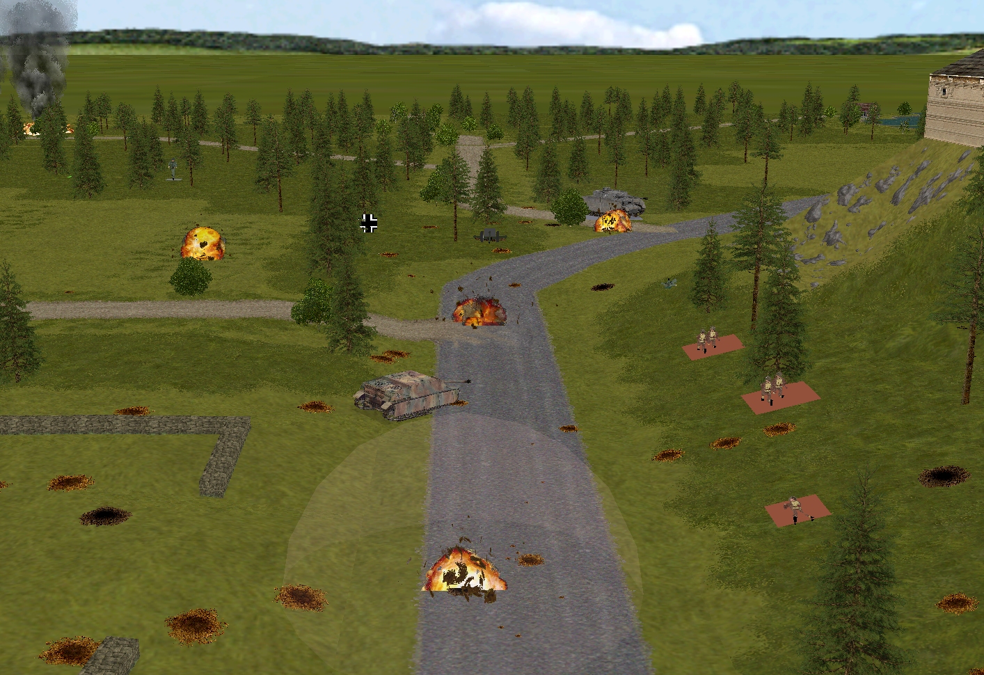 …and, in the final seconds of the sixty, ‘friendly’ 25-pounder rounds explode close to Allied units and the Panzer IV (The above image is a composite).