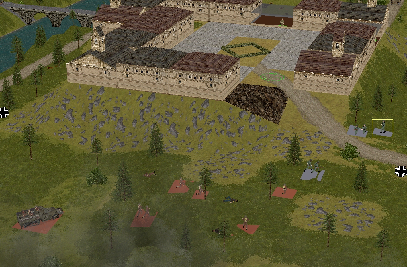 – Captain Dale’s party (Six POWs armed with pilfered rifles and pistols) + Corporal Whitehand’s team (Two POWs armed with a pilfered Panzerschreck)
