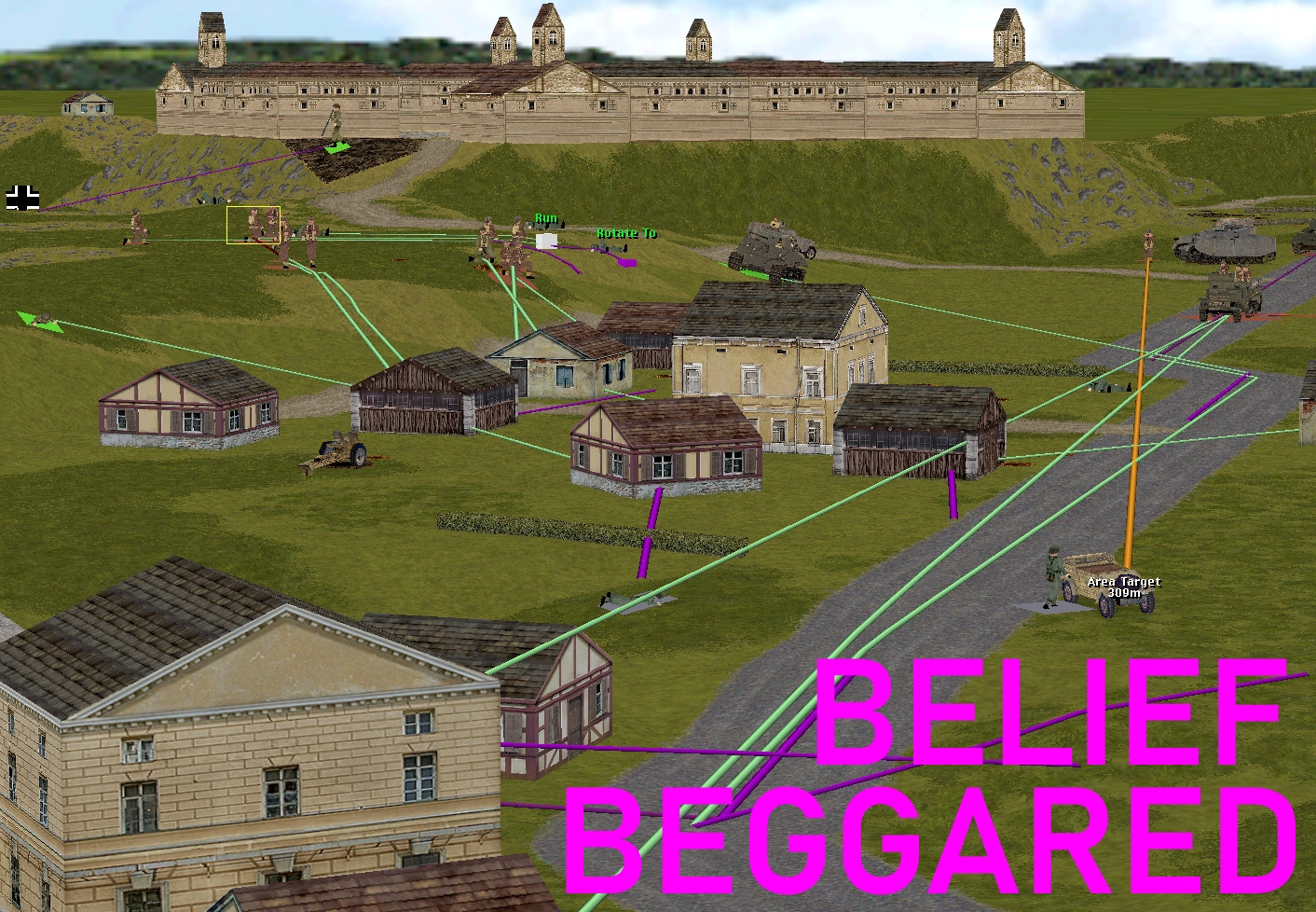 The Comment Commanders’ confidence in the abilities of their artillery spotter and off-map 25-pounder battery is a tad scary. With the finish line of this eight month-long co-op Combat Mission: Beyond Overlord marathon a mere two turns/minutes away, and victory seemingly assured, they choose to launch four rounds of British-made 88mm HE into the midst of a dinky German hamlet alive with Allied vehicles and men!
