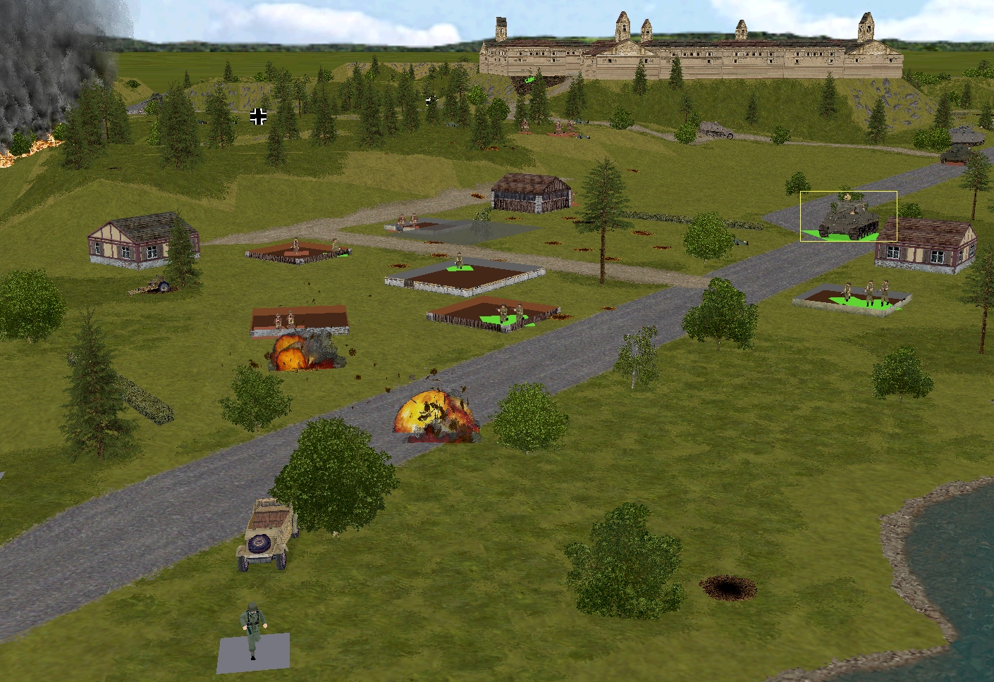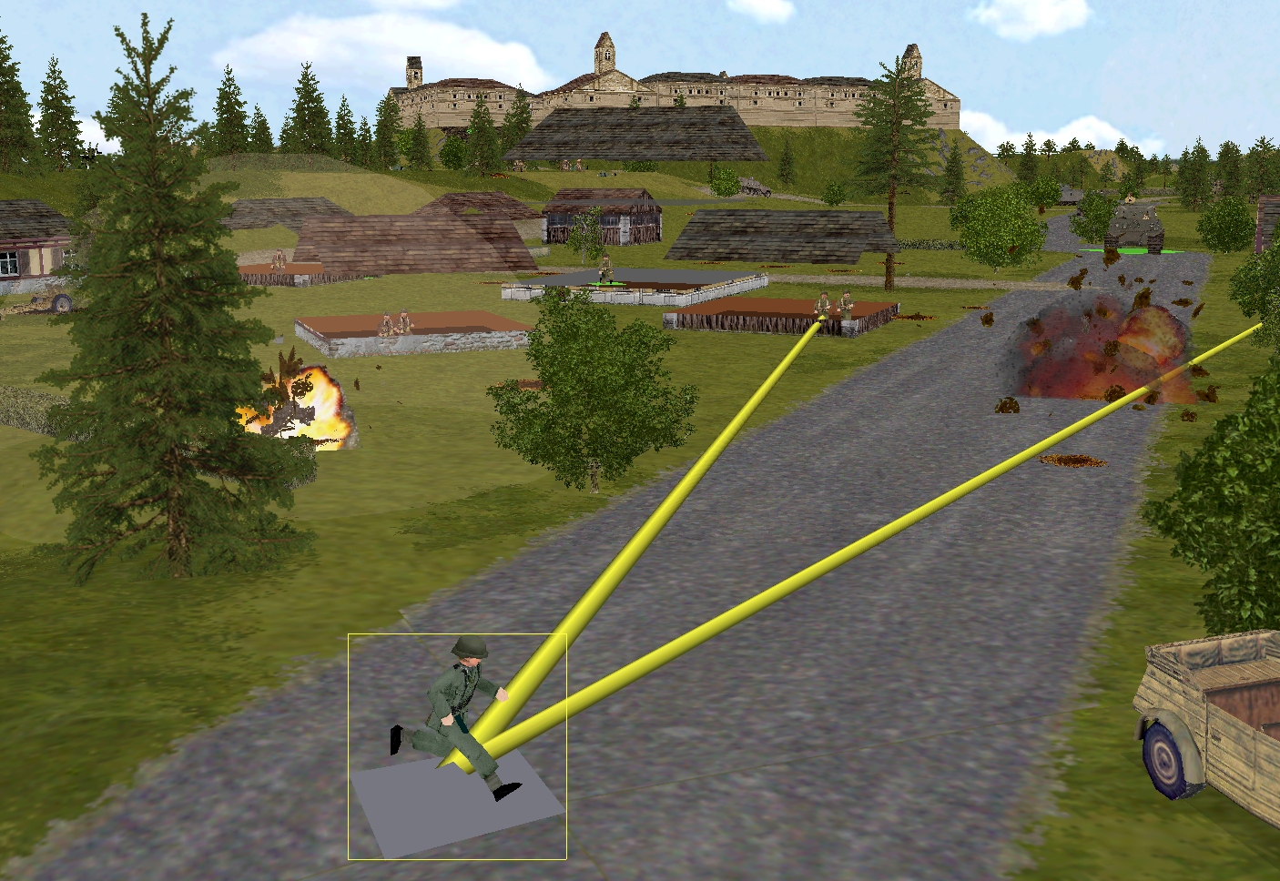 Round no.2 (ringed in the second image) lands roughly twenty paces NW of its bullseye – the innocuous abandoned Kubelwagen.