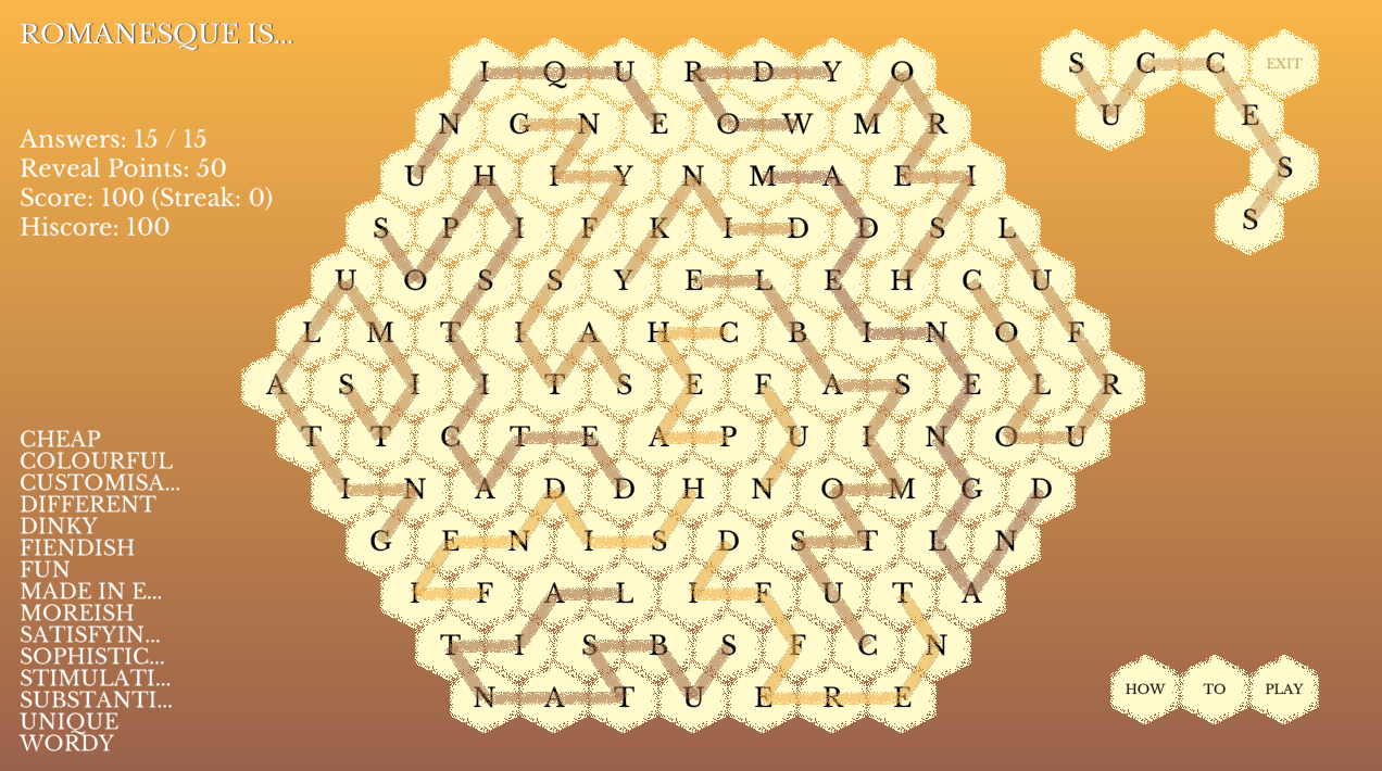 Unlike their inspirations, the themed hexagonal wordsearches in Romanesque are intended for solo play and don’t require prodigious patience or formidable general knowledge skills to solve. Thanks to customisable difficulty, instant answer feedback, and a resource called Reveal Points* everyone should be able to conquer the game’s sizeable campaign and enjoy its moreish skirmish mode.