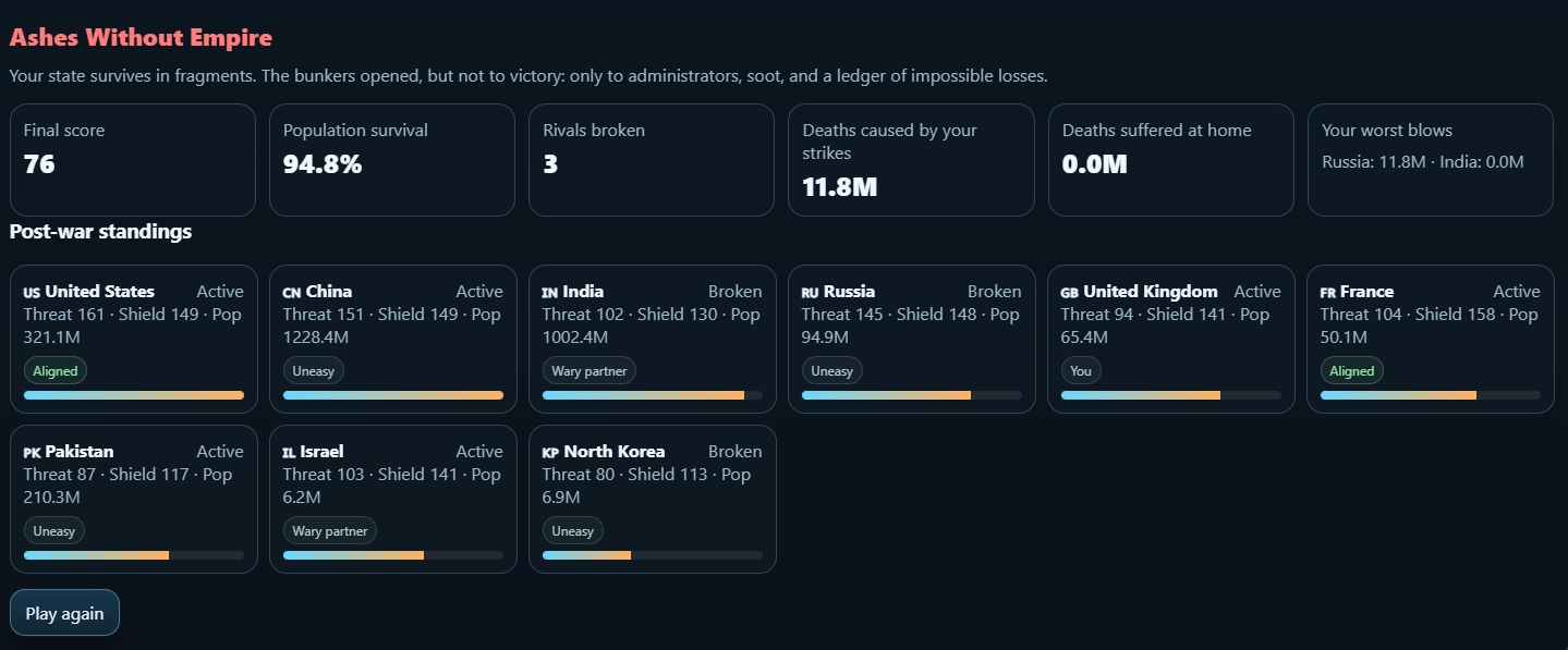 His playable experiments include Last Light Deluxe, an eight-turn end-of-the-world TBS, Street Guns, a “grimy turn-based artillery duel on a live street map”, and Bobsleigh Blitz, a faux-3D bobsleigh sim (“We were well overdue a bobsleigh game so I asked the AI to write one, expecting a quick arcade blast. It started researching the International Bobsleigh & Skeleton Federation rules and building a gravity and friction engine, factoring in centrifugal momentum. The result is an actual sim which my sim-racing friend beats me on.”).