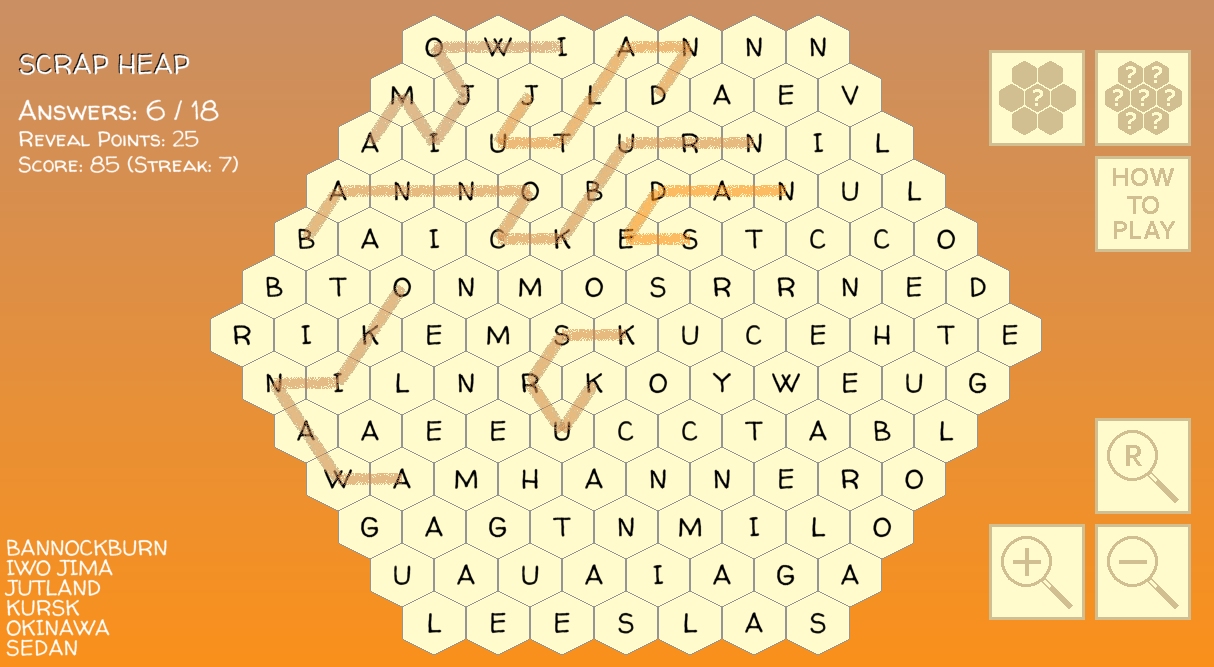 If there’s an appetite for it, Roman will set a weekly Romanesque brainteaser every Sunday from now on. The free web version of our hexy/lexy word game isn’t as smart or substantial as the full Monty, but is more convenient. Click here, and assuming you’re using a PC or tablet (thus far I’ve been unable to get it to work with phones) you should be playing within seconds.